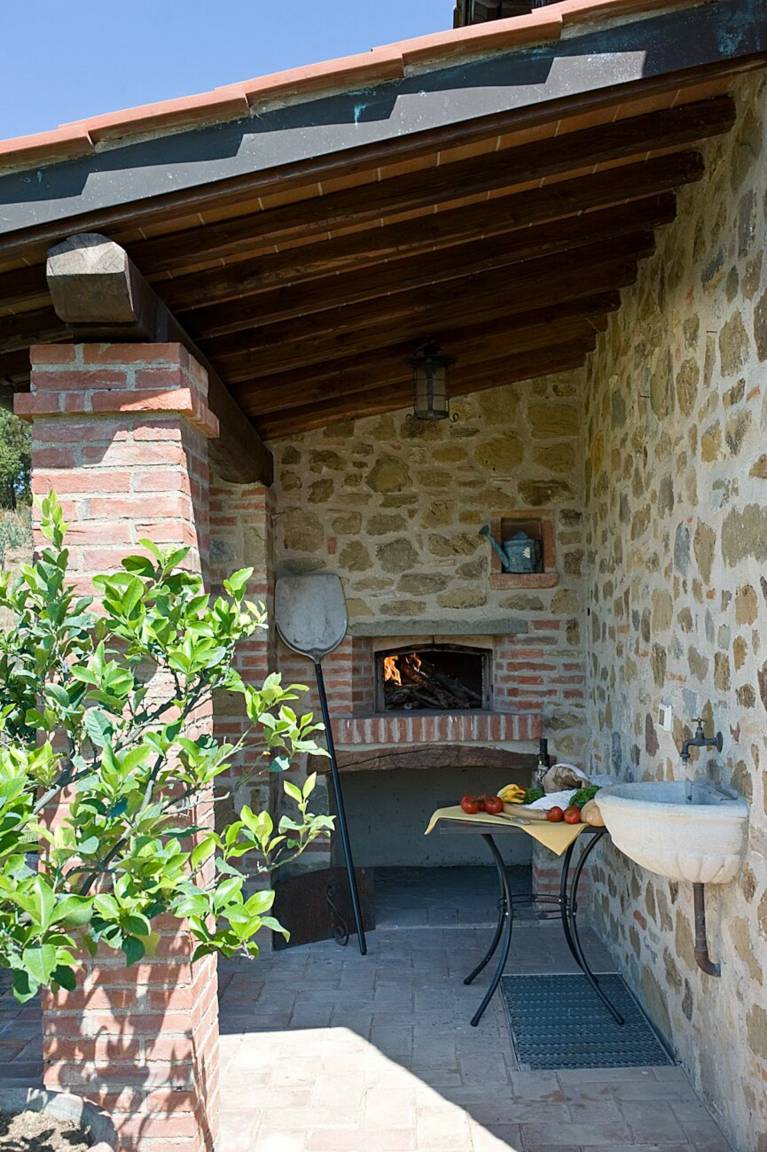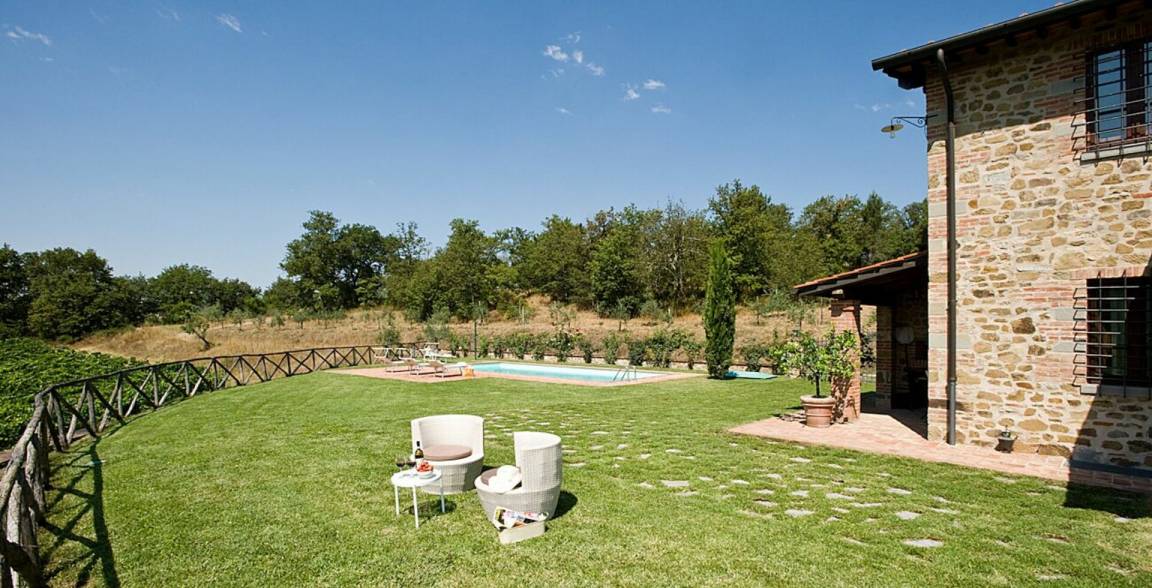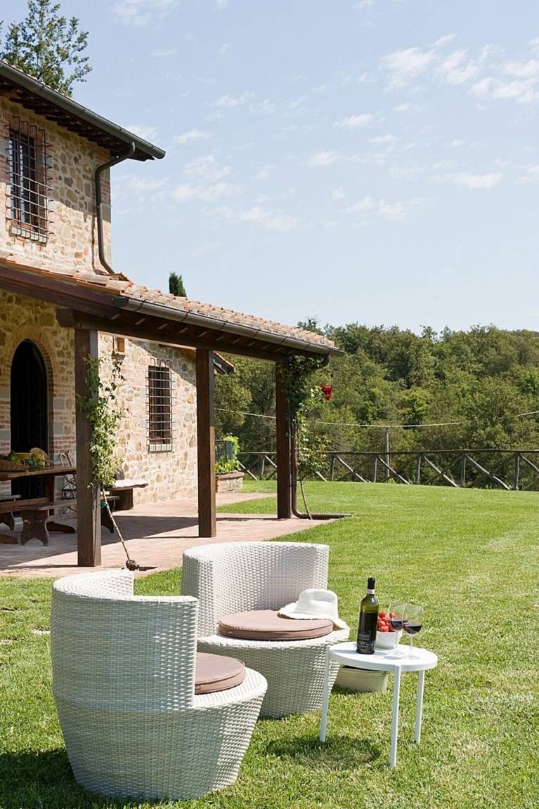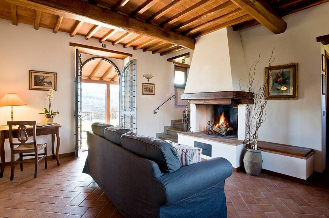 Wohnzimmer: Sofa, Kamin, Satelliten-TV, Ausgang auf den Garten.