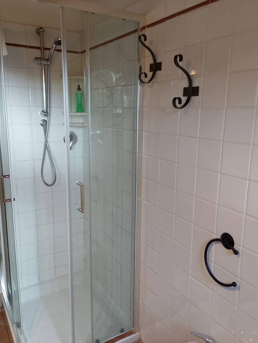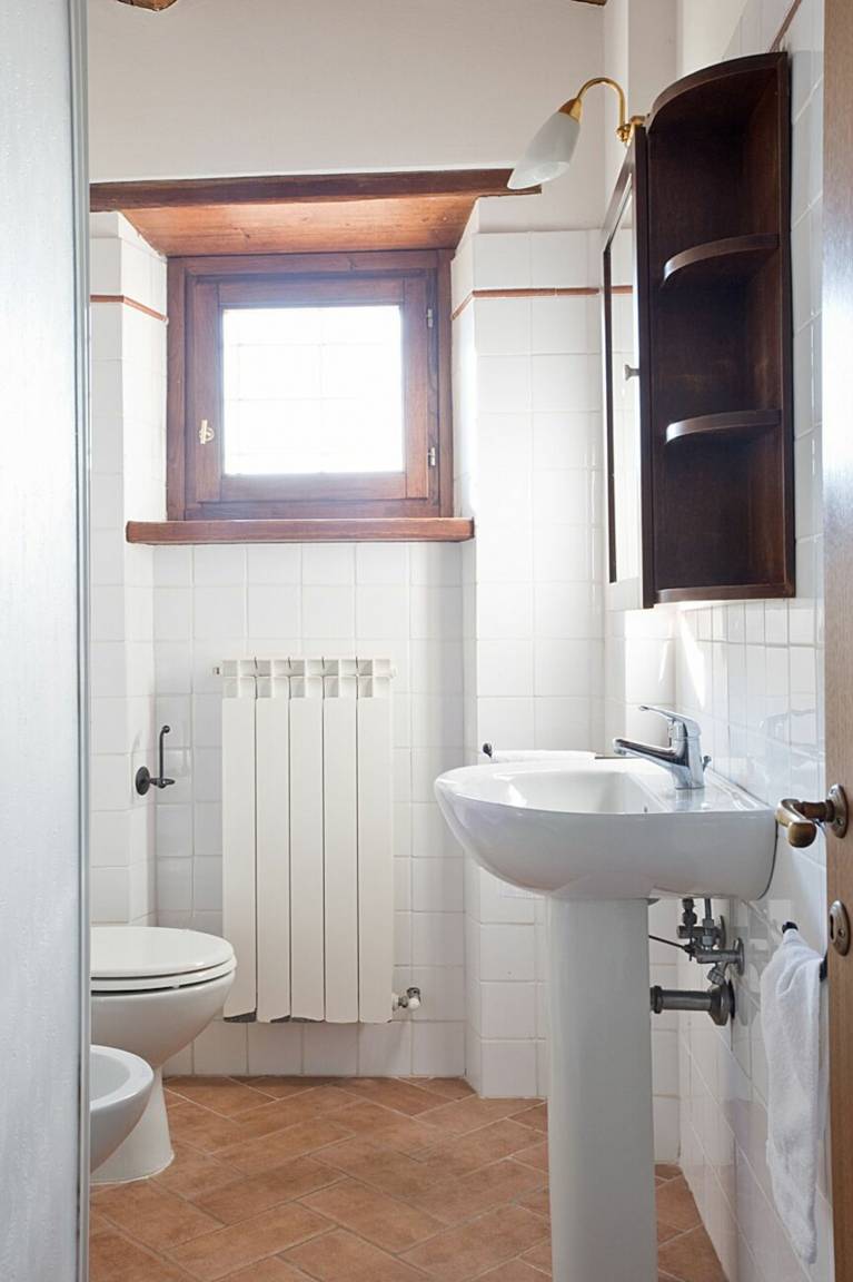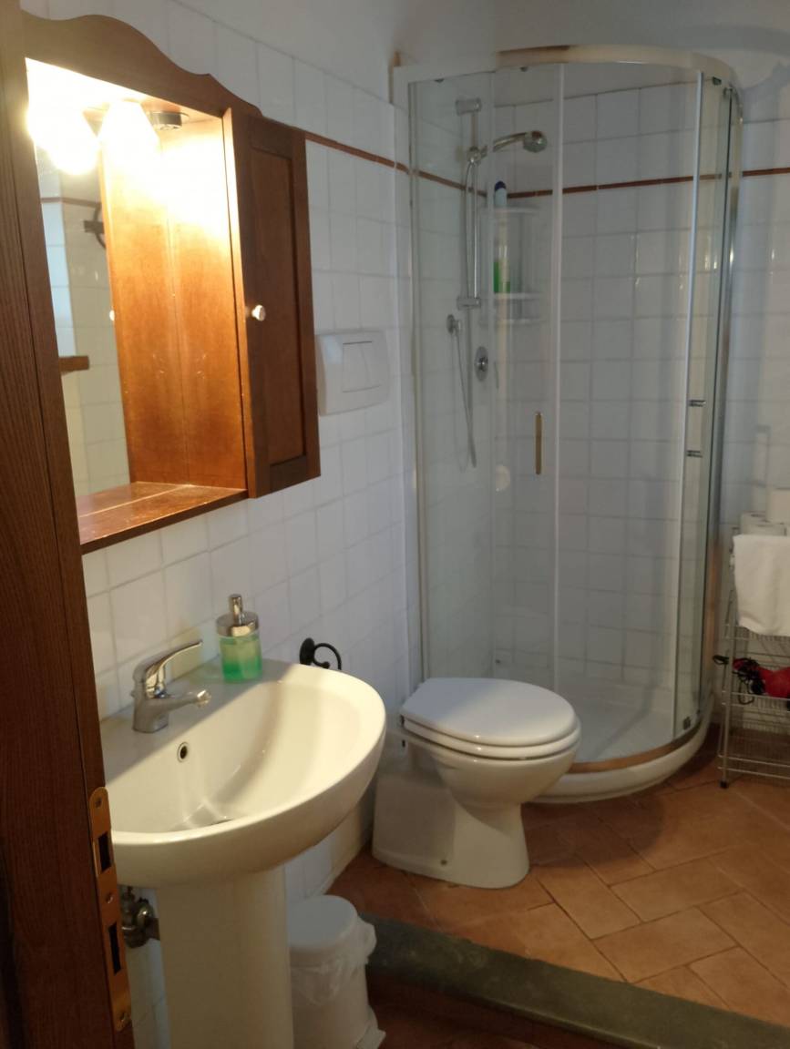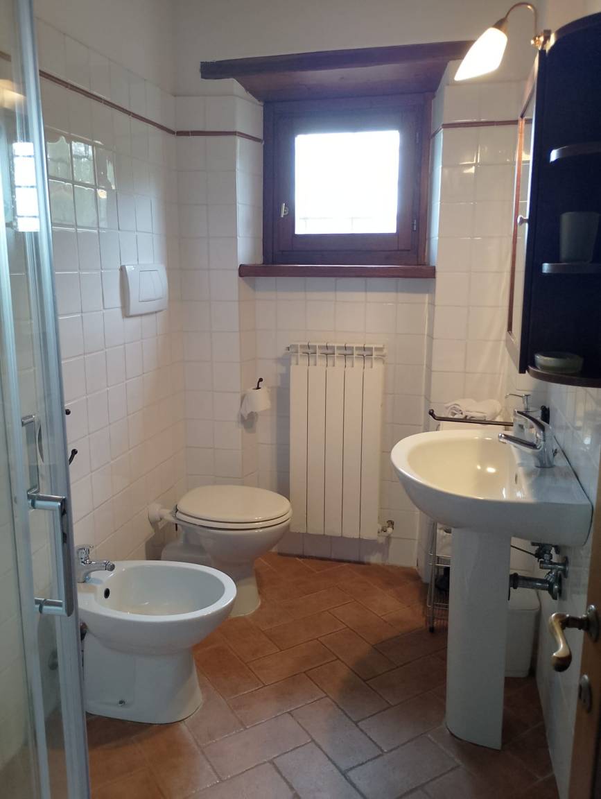 Badezimmer: Waschbecken, WC, Bidet, Dusche.