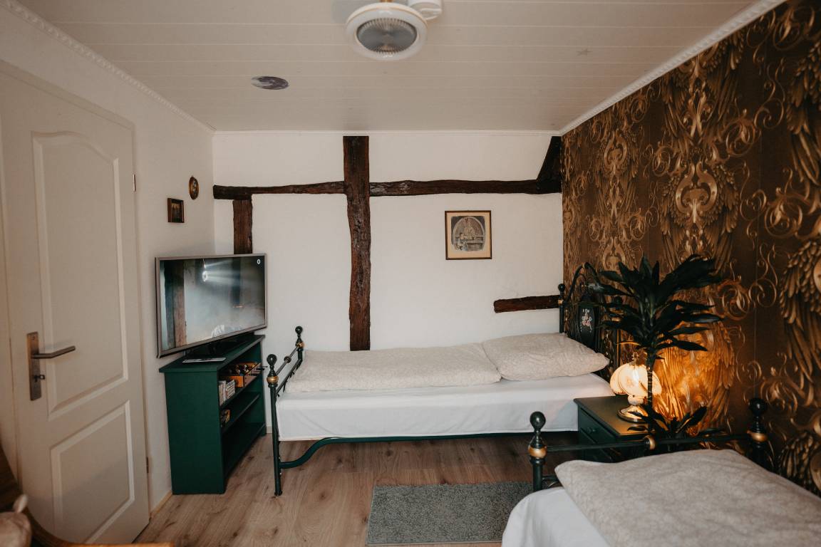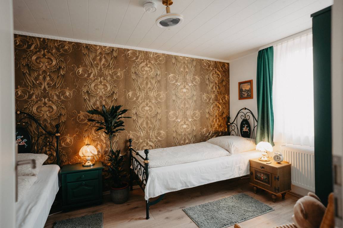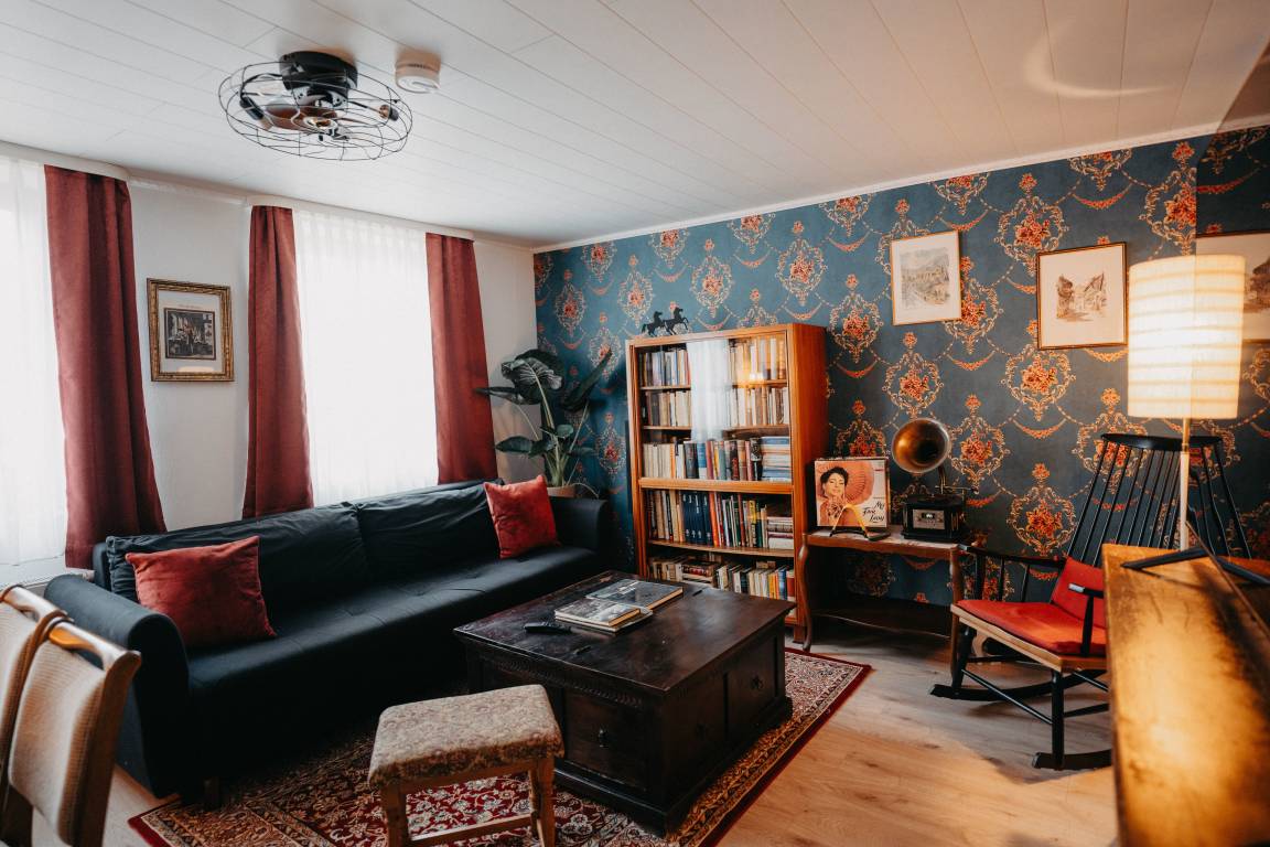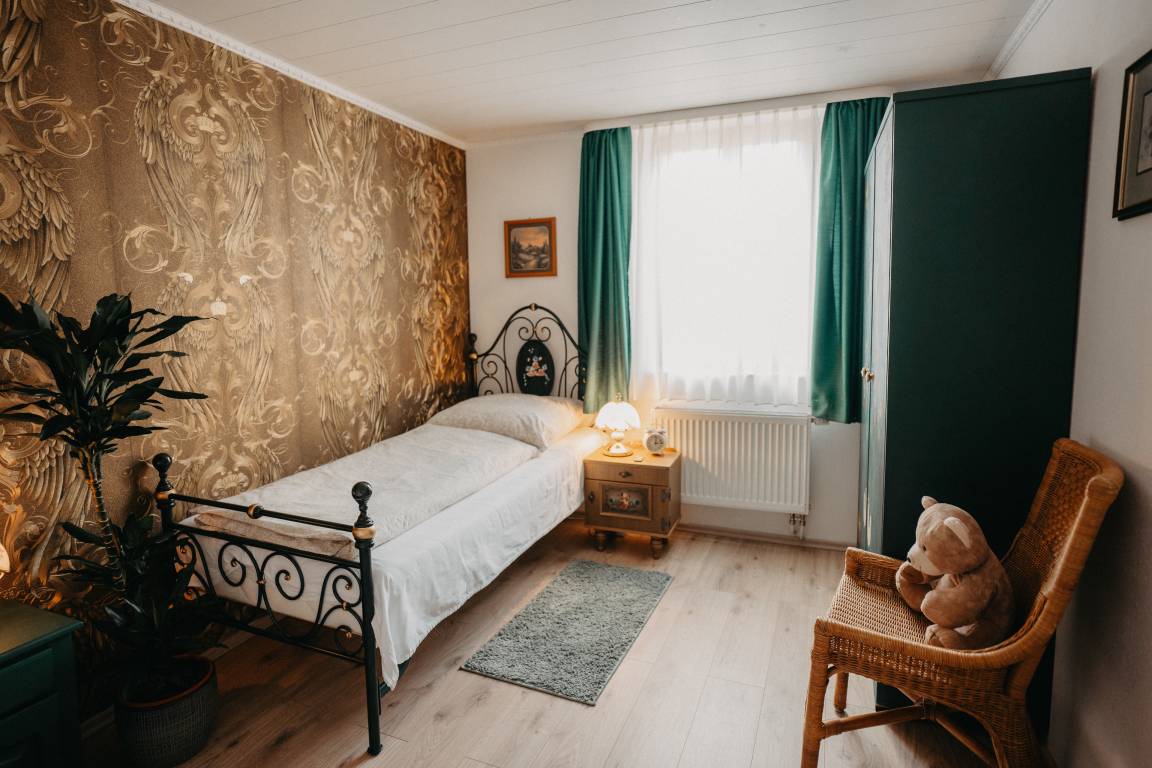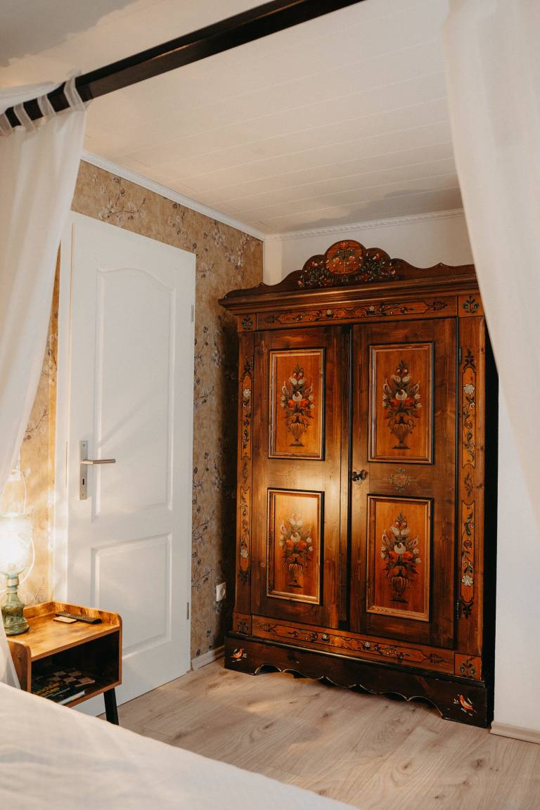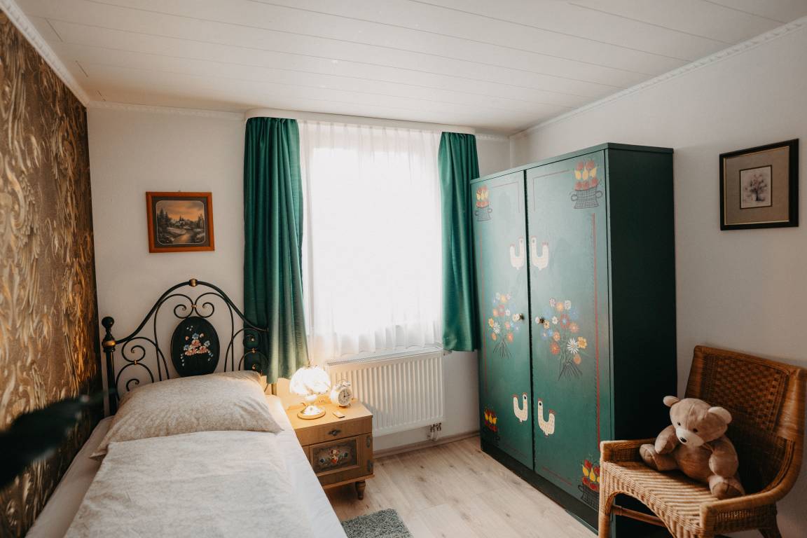 Im ersten Schlafzimmer mit Fenster zum Innenhof können sie königlich schlafen in einem majestätischen Himmelbett. Gegenüber befindet sich das Bad, modern mit begehbarer Dusche. Das Wohnzimmer mit gemütlicher Sitzecke, Bibliothek mit über 400 Bücher Schallplattenspieler, Gesellschaftsspielen und einem riesigen Fernseher mit Wii-Konsole lässt keine Langweile aufkommen. Vom Wohnzimmer kommt man gleich in das zweite Schlafzimmer mit zwei Einzelbetten. Eine Mischung aus altem Bauernschrank und rustikalen Betten wird der Raum in Gold und Grün gehalten.