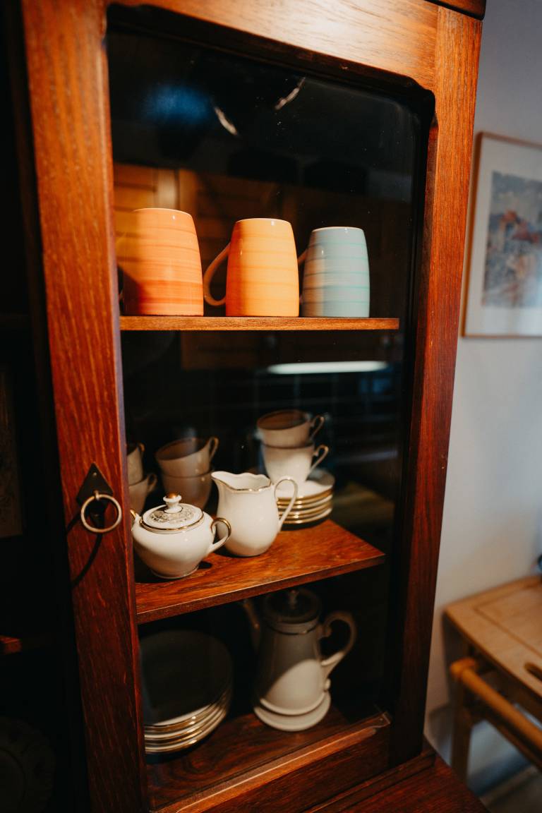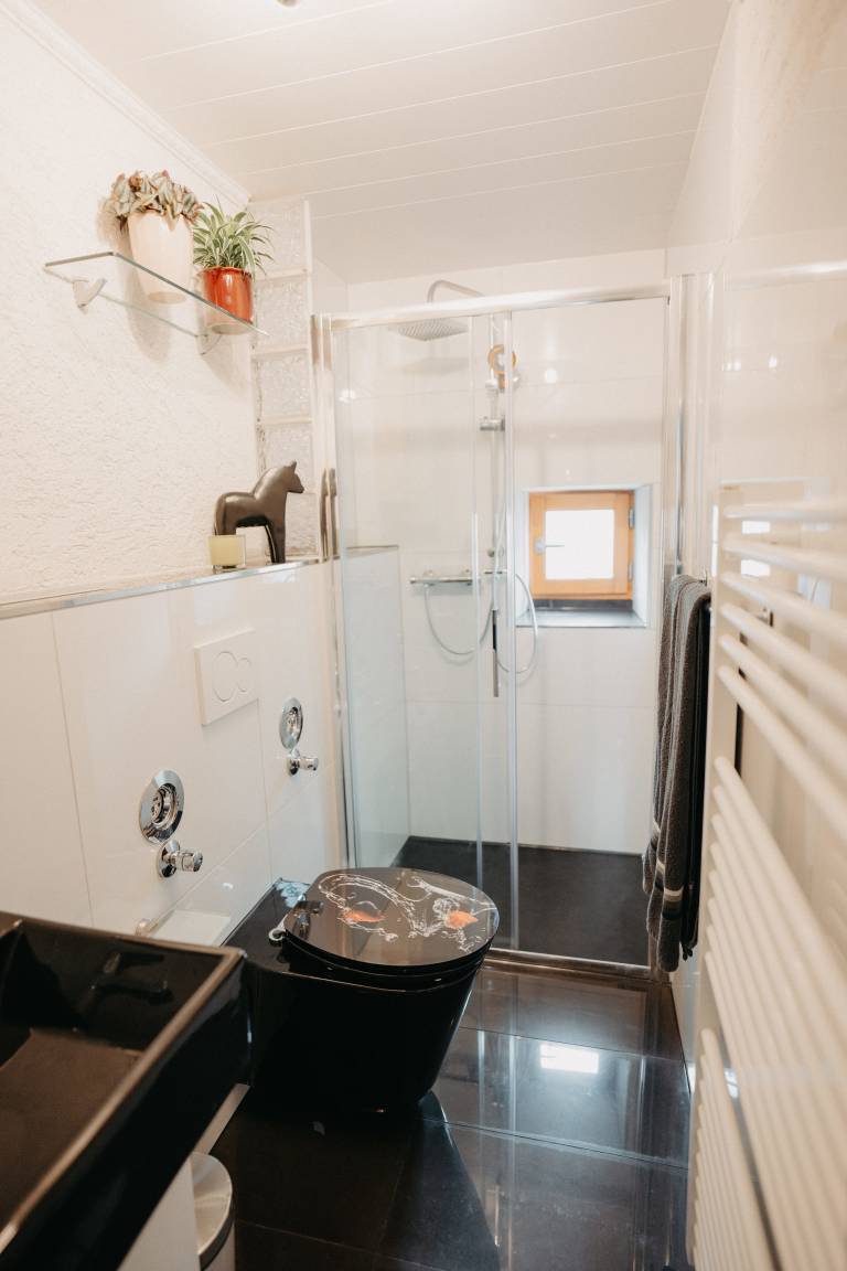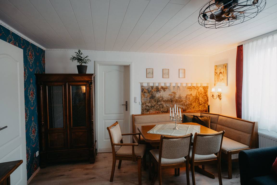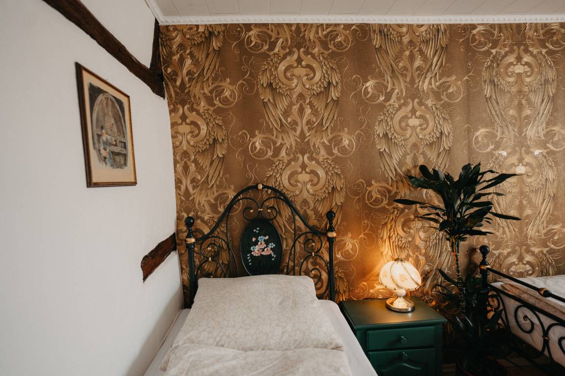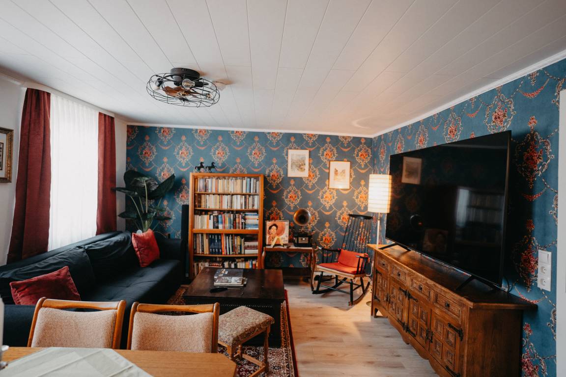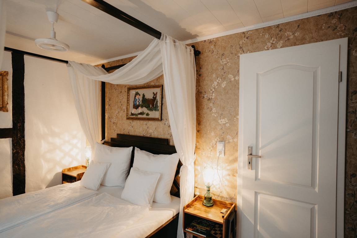 Im ersten Schlafzimmer mit Fenster zum Innenhof können sie königlich schlafen in einem majestätischen Himmelbett. Gegenüber befindet sich das Bad, modern mit begehbarer Dusche. Das Wohnzimmer mit gemütlicher Sitzecke, Bibliothek mit über 400 Bücher Schallplattenspieler, Gesellschaftsspielen und einem riesigen Fernseher mit Wii-Konsole lässt keine Langweile aufkommen. Vom Wohnzimmer kommt man gleich in das zweite Schlafzimmer mit zwei Einzelbetten. Eine Mischung aus altem Bauernschrank und rustikalen Betten wird der Raum in Gold und Grün gehalten.