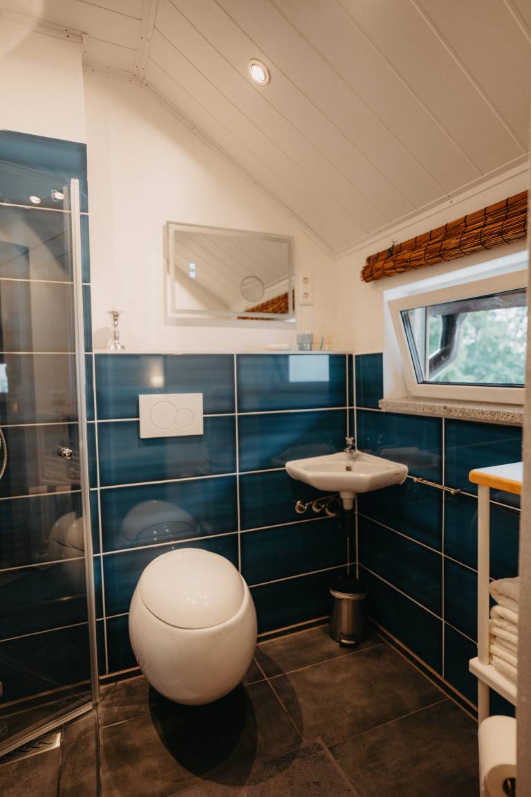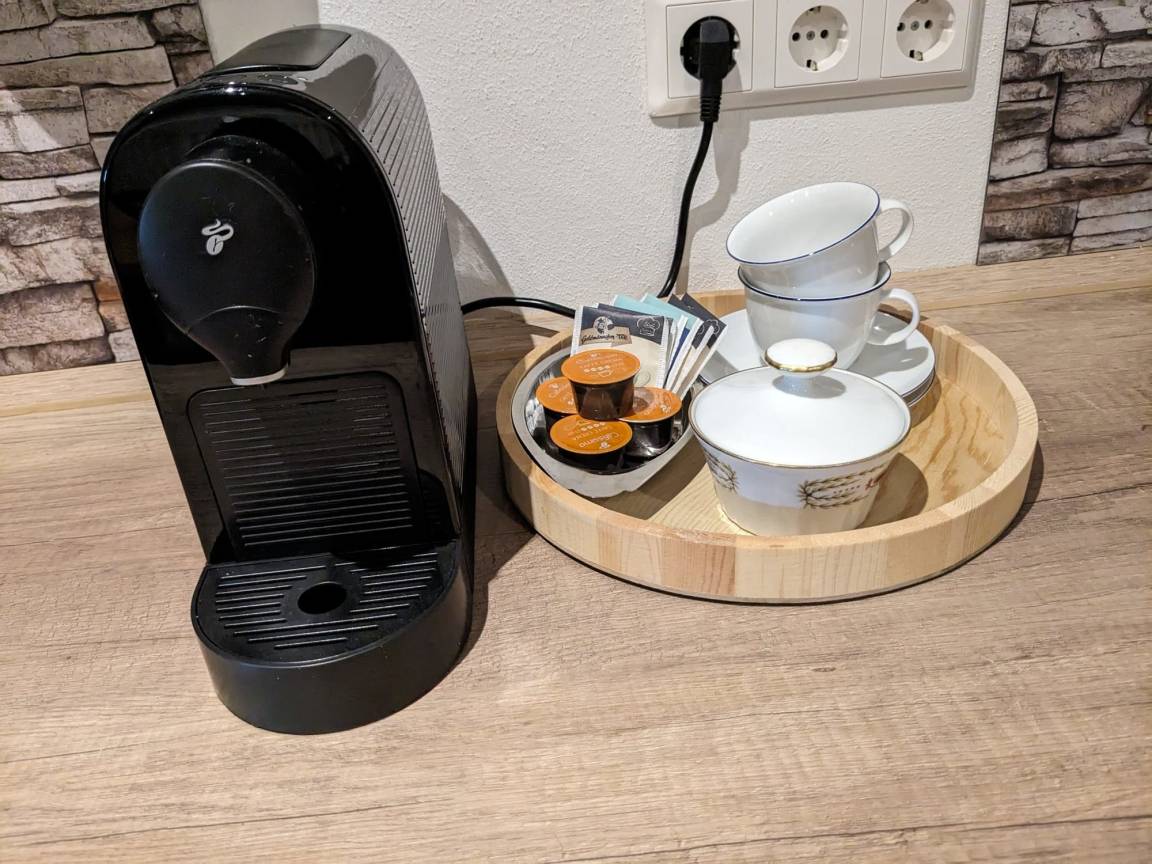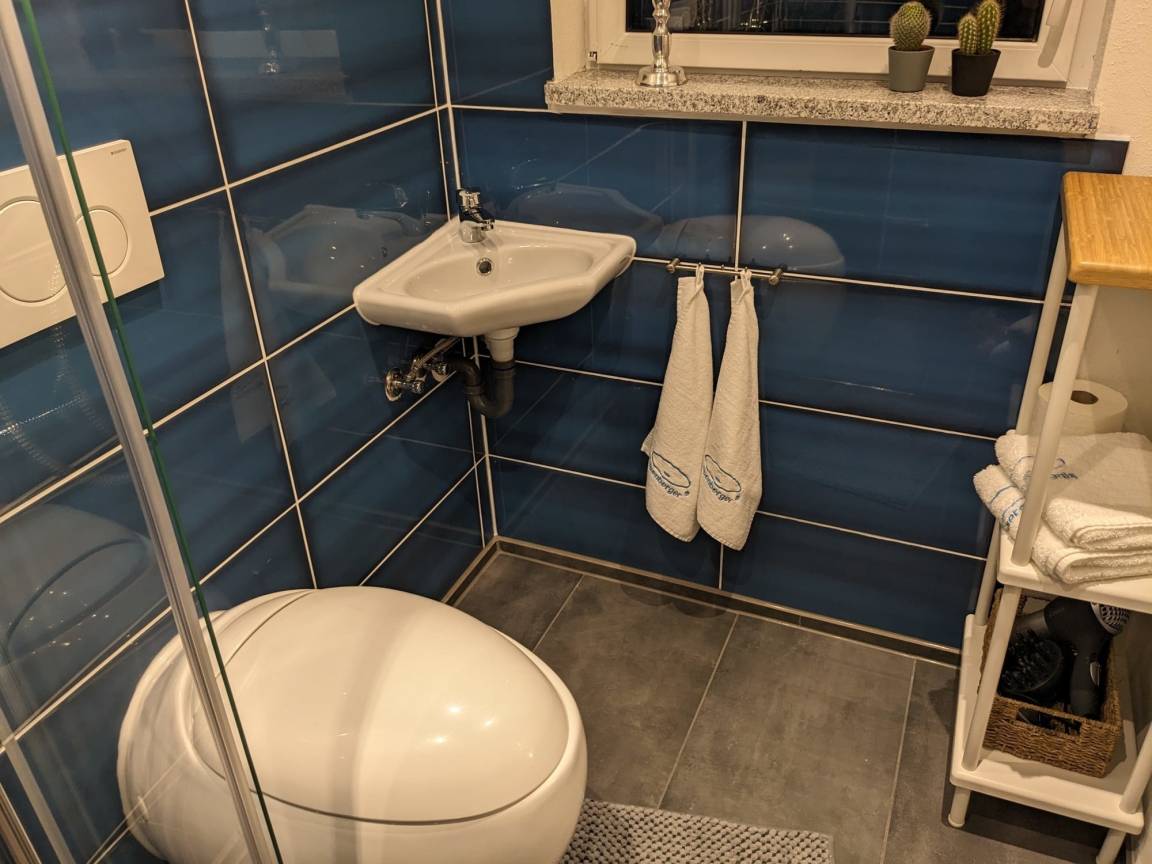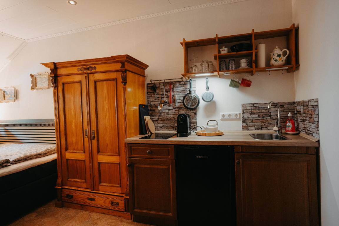 Ihrer Ferienunterkunft befindet sich im ersten Stock im Anbau des Haupthauses. Gleich im Eingangsbereich befindet sich die Garderobe und gleich rechts eine kleine Kochnische. Die Kochecke verfügt über alles was man benötigt, von Kaffeemaschine bis hin zum Kochfeld. Unterm Fenster steht das gemütliche Bett. Ein Schrank und eine Sitzgelegenheit vervollständigt das Raum. Zu Unterhaltung ist ein Fernseher, Bücherregal, Musikanlage vorhanden. Das Badezimmer mit Tageslichtfenster ist modern ausgestattet- ebenerdige Dusche.