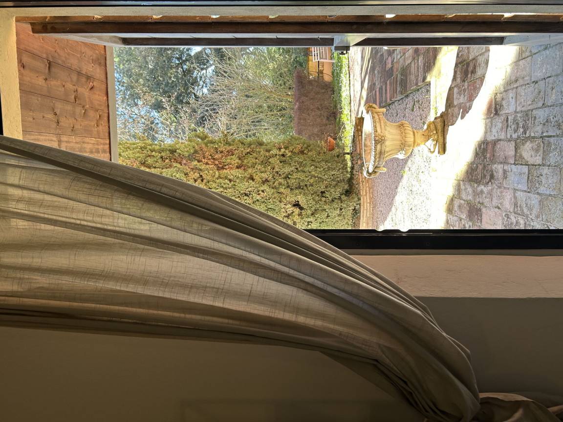 Schlafzimmer mit Bad 2 (25 m²): Doppelbett, Internet, Klimaanlage, Fliegengitter, TV, zwei Sessel, Kühlschrank, Waschbecken, WC, Bidet, Dusche, Fön, Ausgang auf den Garten.