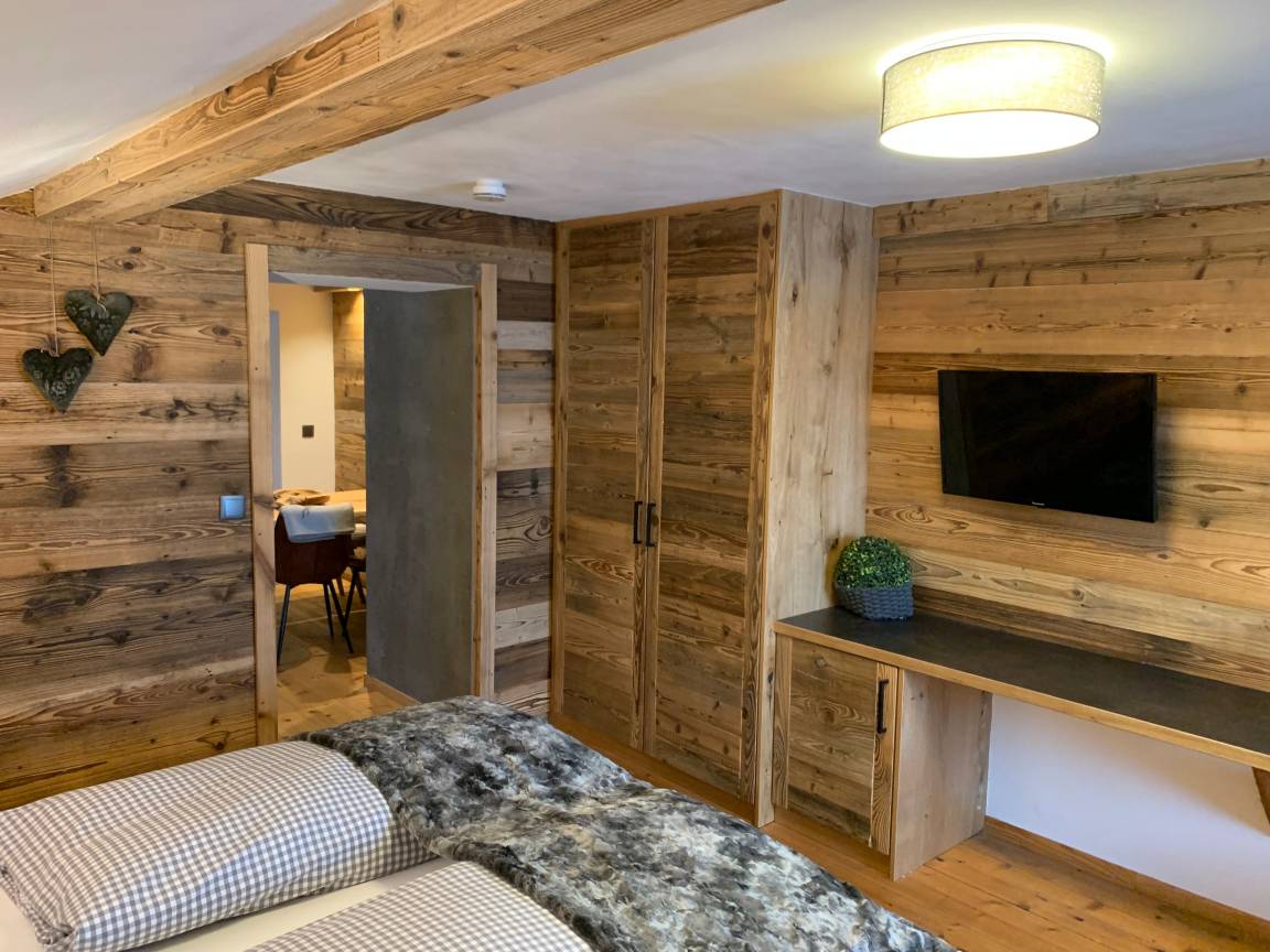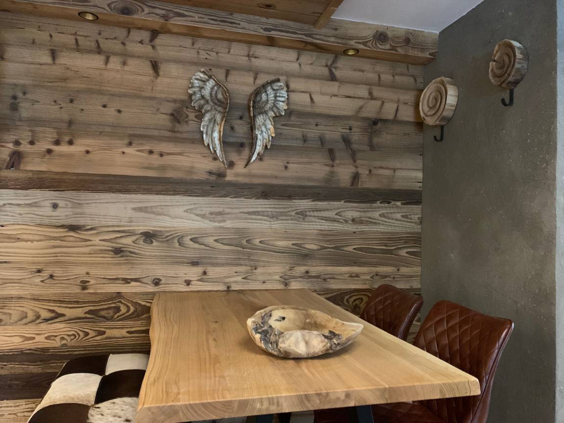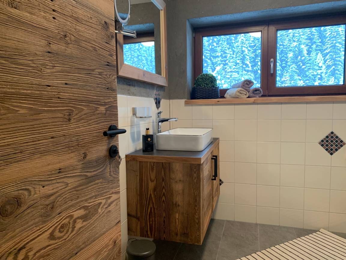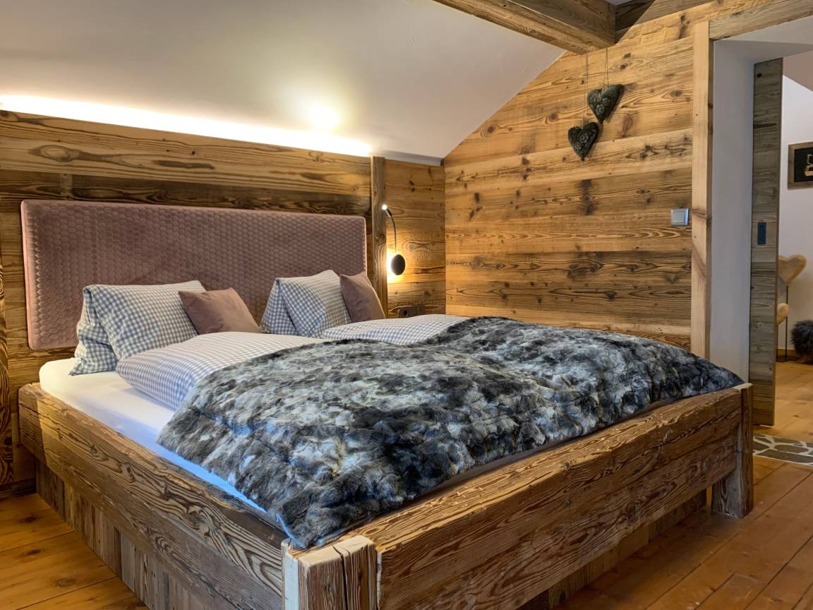 Das Liara befindet sich im 2.Stock und verfügt über einen eigene Infrarotkabine und einen Balkon mit Blick auf den Grubigstein. Die Wände in Altholz, eine Steinmauer, moderner Hüttenstyle, gemütliches Lichtkonzept, hochwertige Möbel aus Holz, Verdunklungs-Vorhänge, W-Lan.