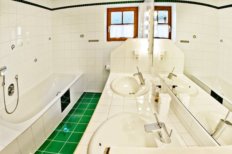 Eckbanksitzgruppe, ein Bad mit zwei Waschbecken, Badewanne und extra