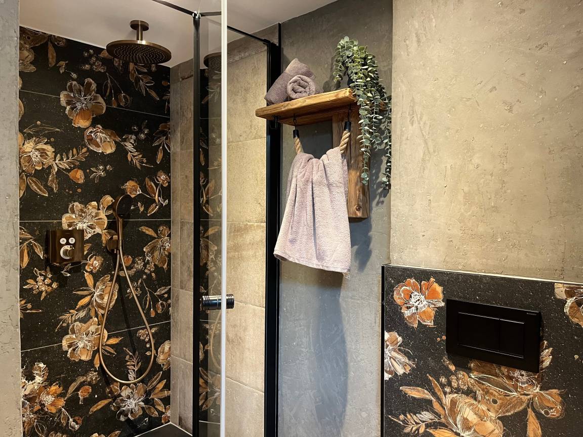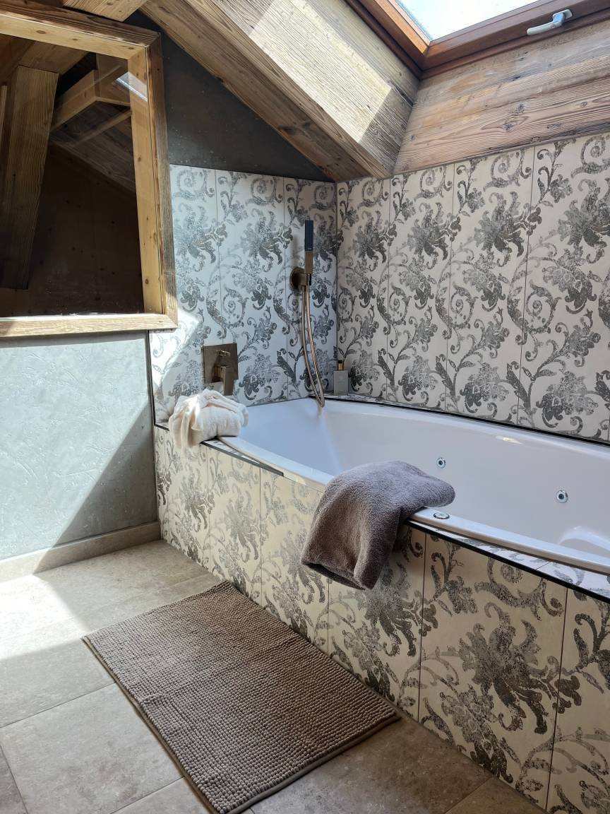 Das Badezimmer verfügt über eine Badewanne, Infrarot Kabine, Regendusche, Waschbecken, Kosmetik-Vergrößerungs-Spiegel, Spiegel, Föhn, WC und ist mit Badetücher bestückt.