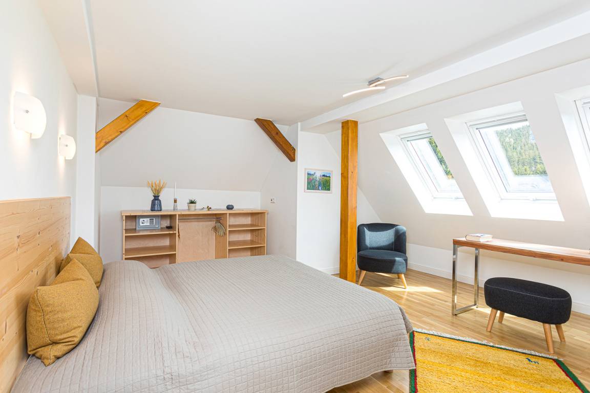 Die Alte Försterei Wildenthal in Eibenstock bietet Ihnen fünf schöne Ferienwohnungen direkt am Kammweg Erzgebirge. Ideal zum Wandern und Erholen. Herrlich Ausspannen lässt es sich in unserer großen Familien Ferienwohnung für 4 Personen im Dachgeschoss. Im Wohnraum sind modernes Kochen und Relaxzeit die wesentlichen Elemente. In 2 geräumigen Schlafzimmern je mit Duschbad und der großen Sauna erholen Sie sich ganz privat. Der 360° Panoramablick macht es perfekt.