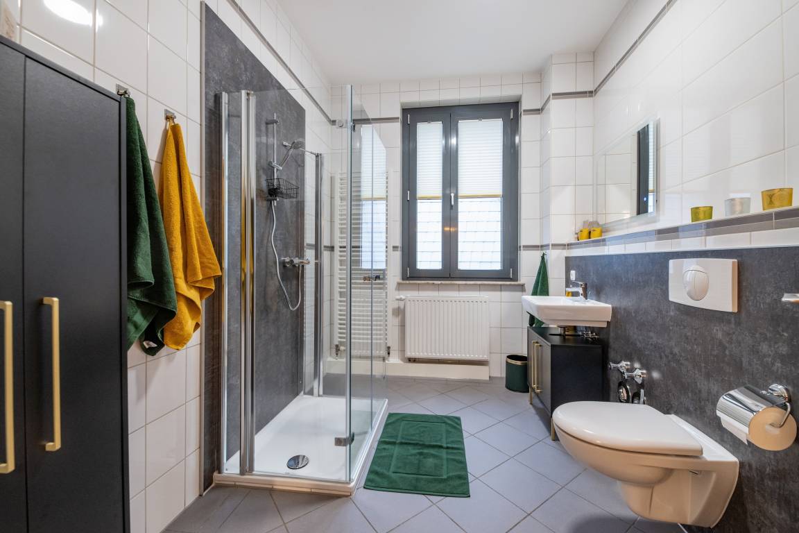 Das Bad ist mit einem großem Spiegel, Dusche, Waschbecken, WC und einem Haartrockner ausgestattet. Zusätzlich steht ein Set aus Zahnbürste, Schuhschwamm, Hygiene- und Nähutensilien, Körperlotion, Duschgel sowie zwei Toilettenpapierrollen zur Verfügung.