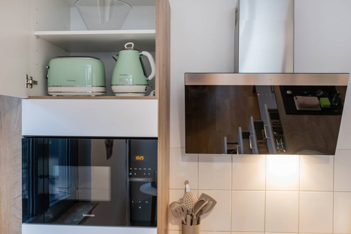Der stilvoll eingerichtete Wohn-/ Schlafbereich, der Flur sowie die geräumige Küche sind mit Parkettboden versehen. Die Komfortküche ist großzügig mit Geschirr, Besteck, Töpfen und Pfannen, sowie einem Spüllappen, einem Schwamm, einer Geschirrspülbürste, zwei Geschirrspültabs, Spülmittel, Küchenrolle, Salz und Pfeffer ausgestattet. Zusätzlich stellen wir als Willkommenspacket etwas Kaffeepulver, Filtertüten, Teebeutel, Zucker und Kondensmilch bereit. Das offene Wohnkonzept mit einem großen Doppelbett (2x2m), sowie einer bequemen Ottomane lädt dazu ein, Ihren Aufenthalt nach Ihren persönlichen Bedürfnissen zu gestalten und zu genießen.