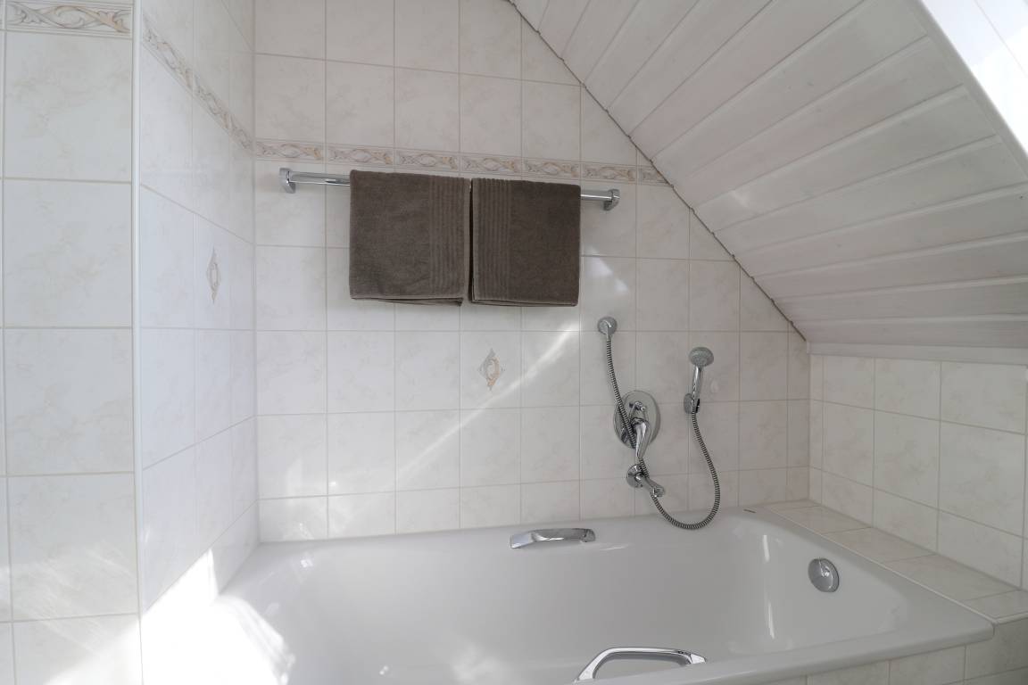 - 1 Schlafzimmer im OG mit Doppelbett (180 x 200), TV und Badezimmer mit Badewanne, Dusche und WC