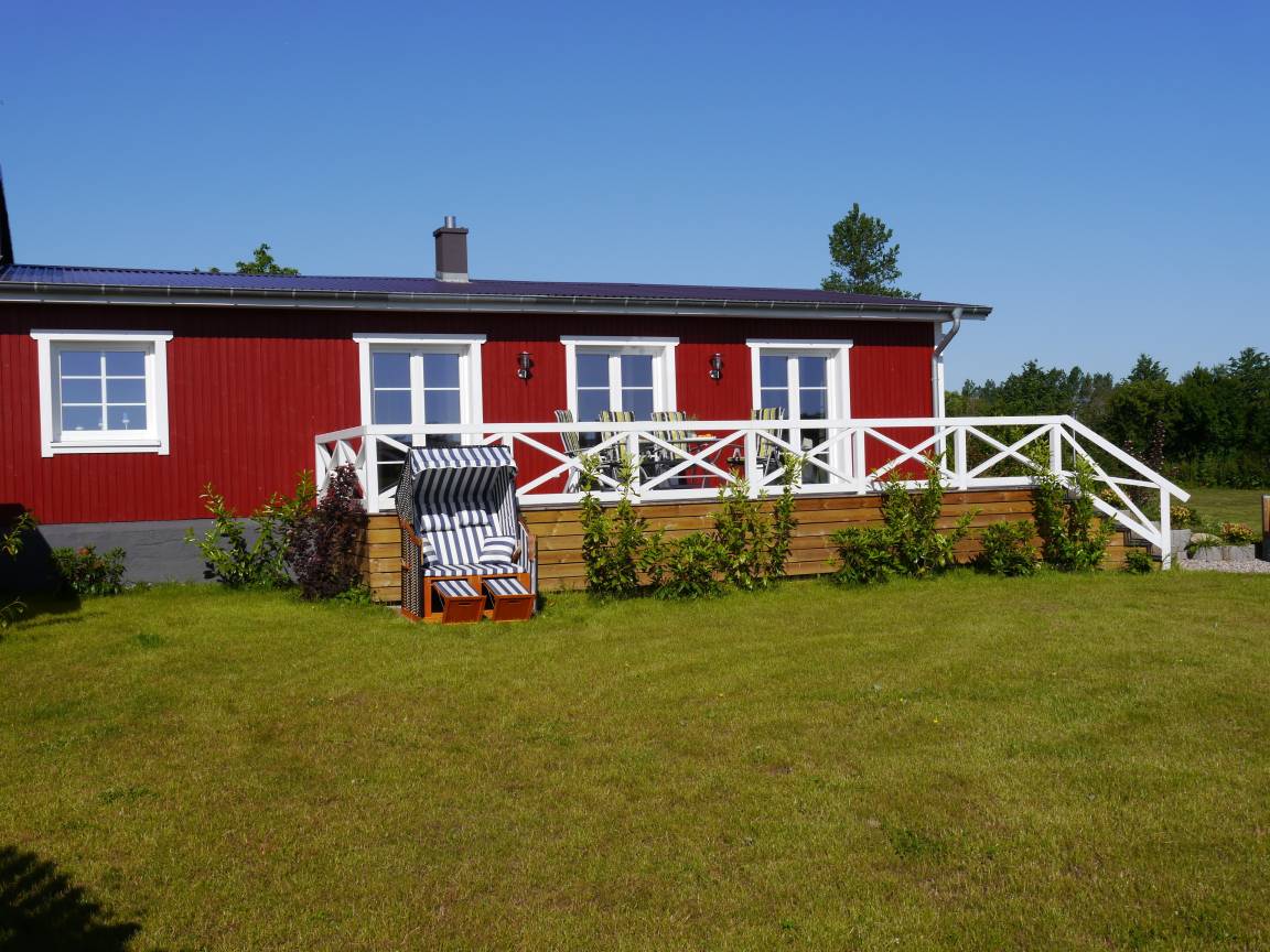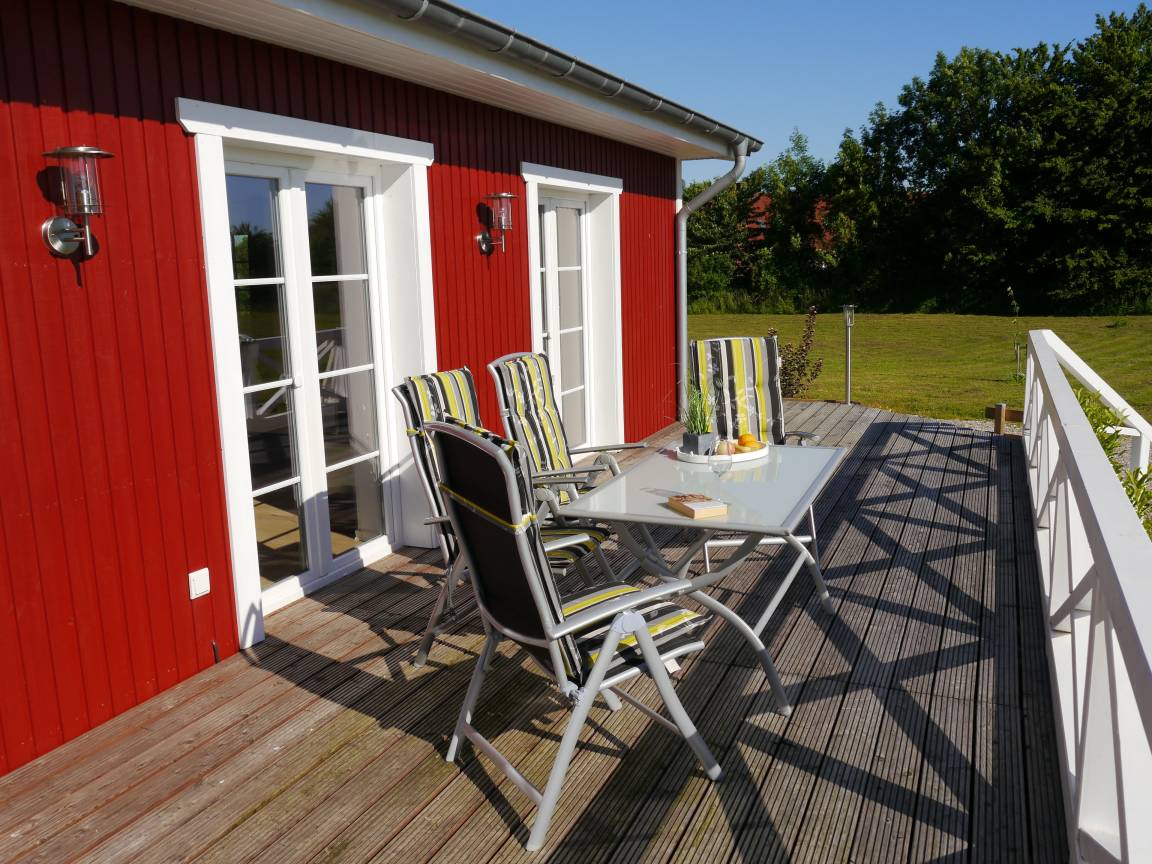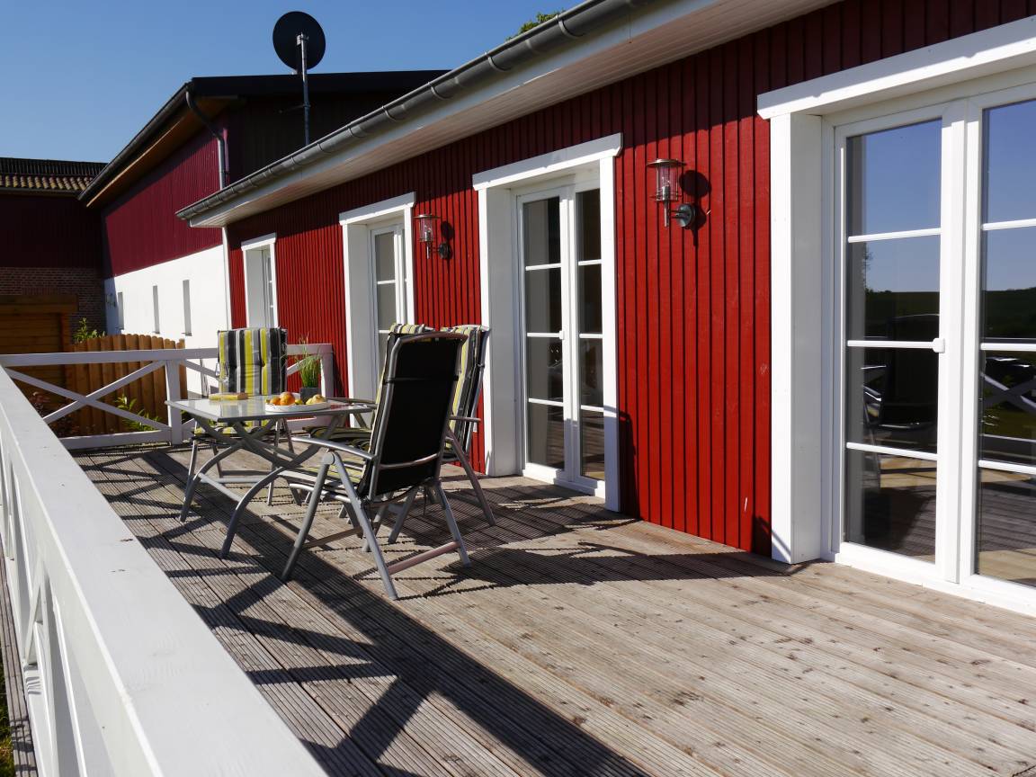 Auf unserem Bücherregal stehen verschiedene Bücher, Videos, DVD's und Spiele für Kinder und Erwachsene. Von diesem großzügigen Wohnraum aus haben Sie direkten Zugang auf die 40 Quadratmeter große Holzterrasse mit gemütlichen Gartenmöbeln, Liegen und Sonnenschirm.