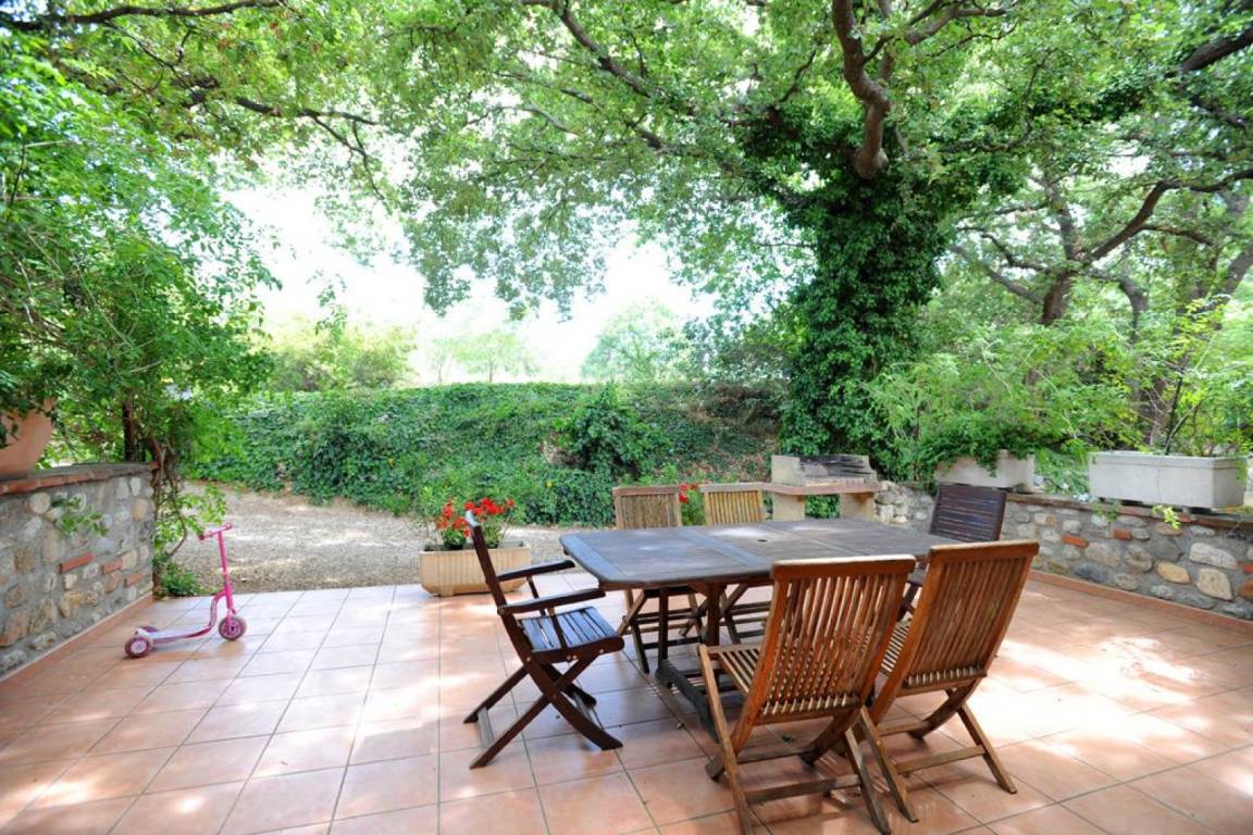 Private, schattige Terrasse mit Grill und Gartenmöbeln