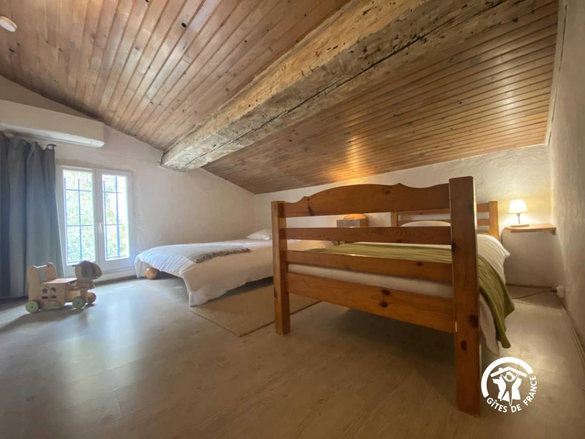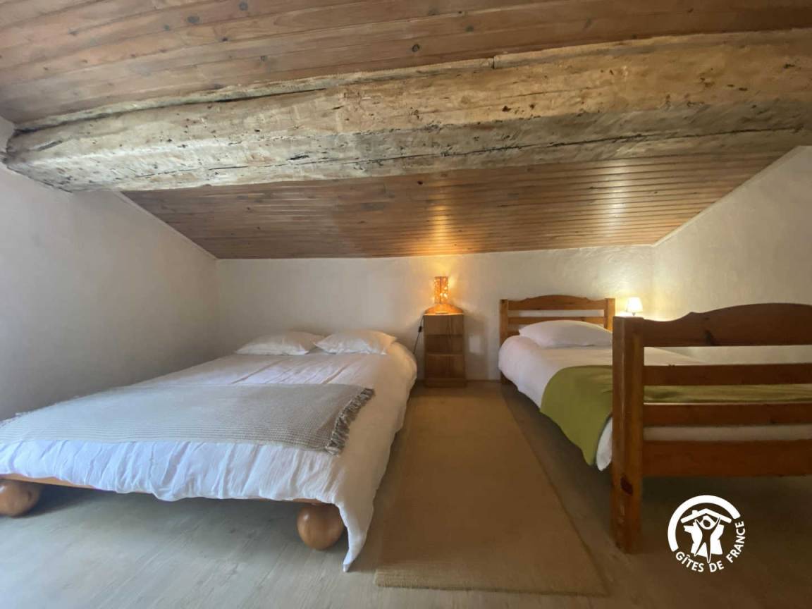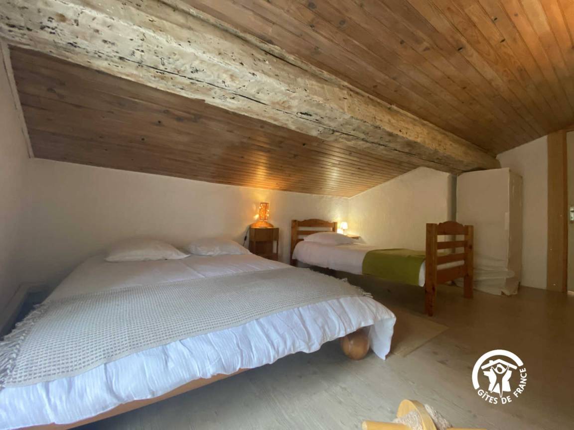 Im Dachgeschoss unter der Dachschräge befindet sich ein Schlafzimmer mit einem Doppelbett und einem Einzelbett.