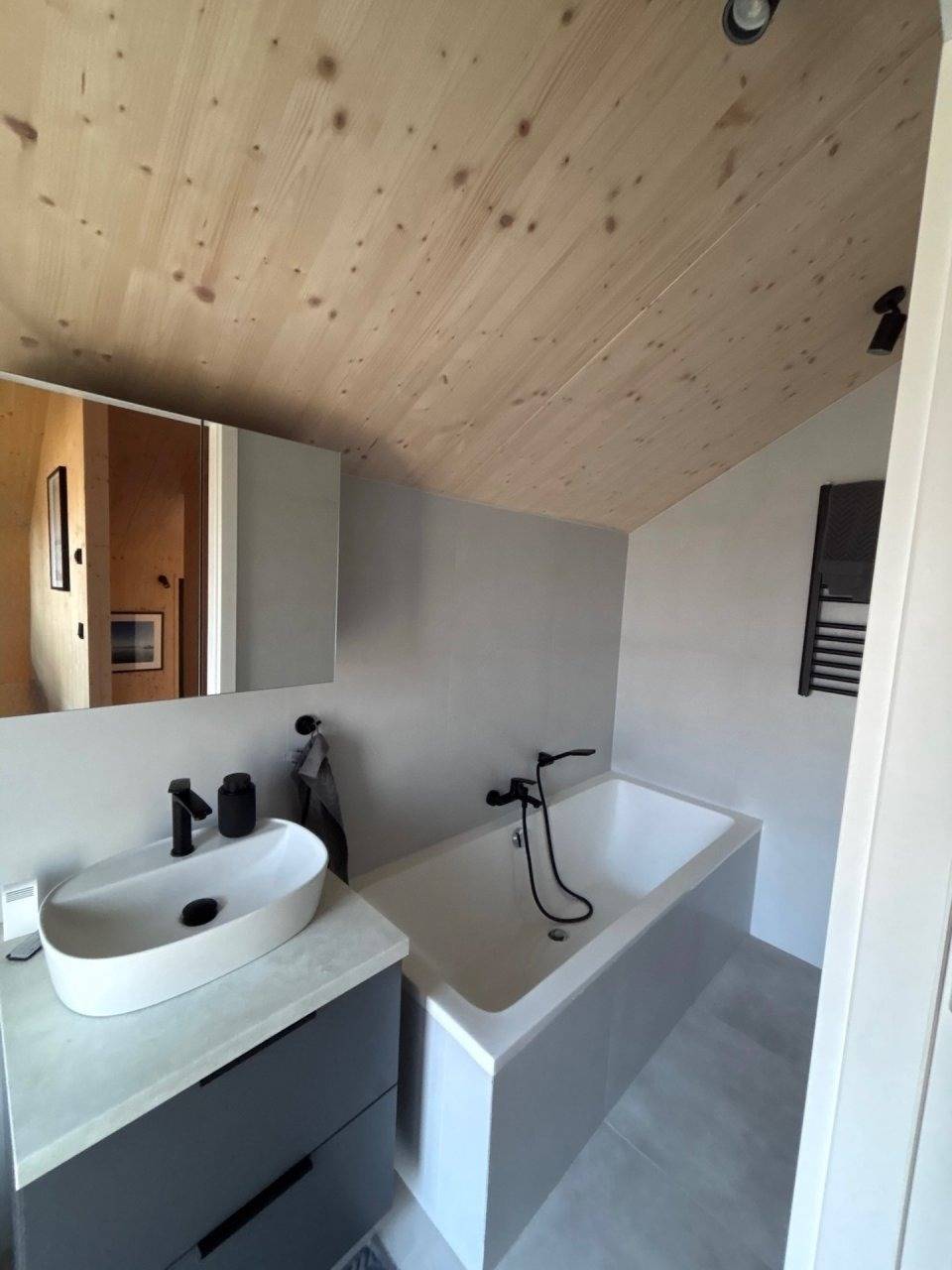 Auf 74 m² finden bis zu fünf Personen Platz. Zwei Schlafzimmer mit komfortablen Doppelbetten (1,60 m & 1,90 m), einem kleinen Arbeitszimmer und einer Schlafcouch (1,20 m) im Wohnbereich, sowie zwei moderne Badezimmer sorgen für Komfort: Im Erdgeschoss mit Dusche und WC, im Obergeschoss mit Badewanne und WC. Das Arbeitszimmer eignet sich zudem ideal als Rückzugsort zum Lesen oder Arbeiten.