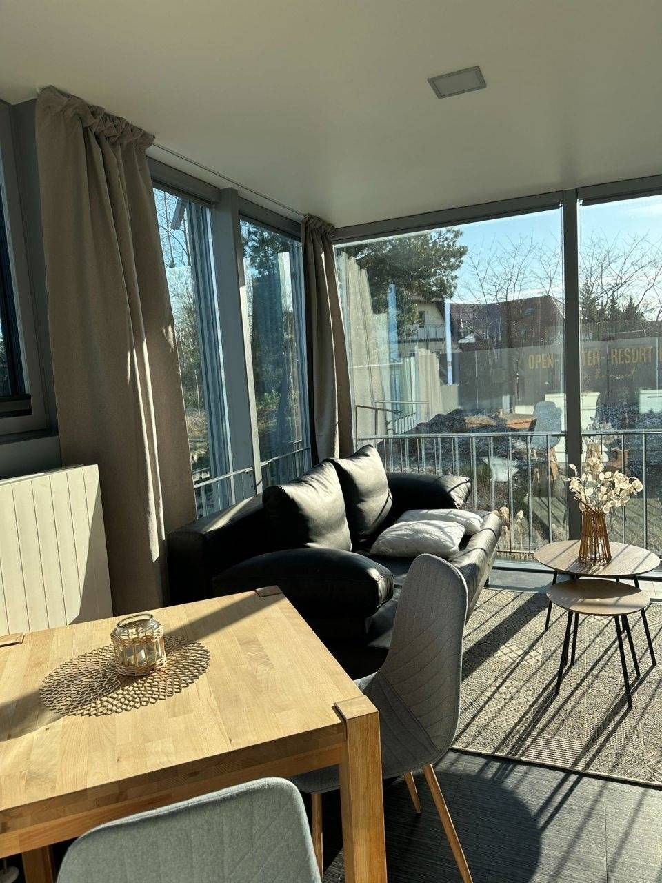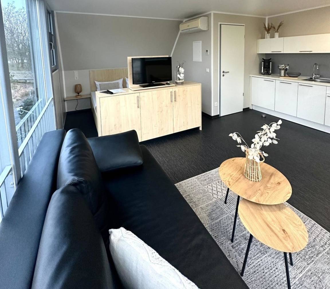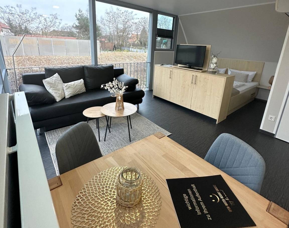 Genießen Sie in unseren komfortablen, geschmackvoll eingerichteten und lichtdurchfluteten Appartements Düne Ihren Aufenthalt im Lausitz Resort. Diese Appartements befinden sich im 2. Obergeschoss des Strandhauses und bieten auf ca. 25 m² Platz für 2 Personen. Ausstattungsmerkmale:Wohn-/Schlafbereich voll klimatisiertDoppelbett im abgegrenzten WohnbereichWohnsofaTV Flachbildschirm mit Radiooffene, voll ausgestattete Küche (Geschirrspüler mit Startpaket, Kühlschrank, 2 Ceran - Kochfelder, Bistroofen, Kaffeemaschine, Wasserkocher), diverse KüchenutensilienBadezimmer mit Dusche/WC, Schminkspiegel und Föhnausgestattet mit Bettwäsche und Handtücher Dachterrassse mit Loungeinsel und EssbereichWLAN inklusiveein kostenfreier PKW-StellplatzHundemitnahme nur unter Voranmeldung möglich