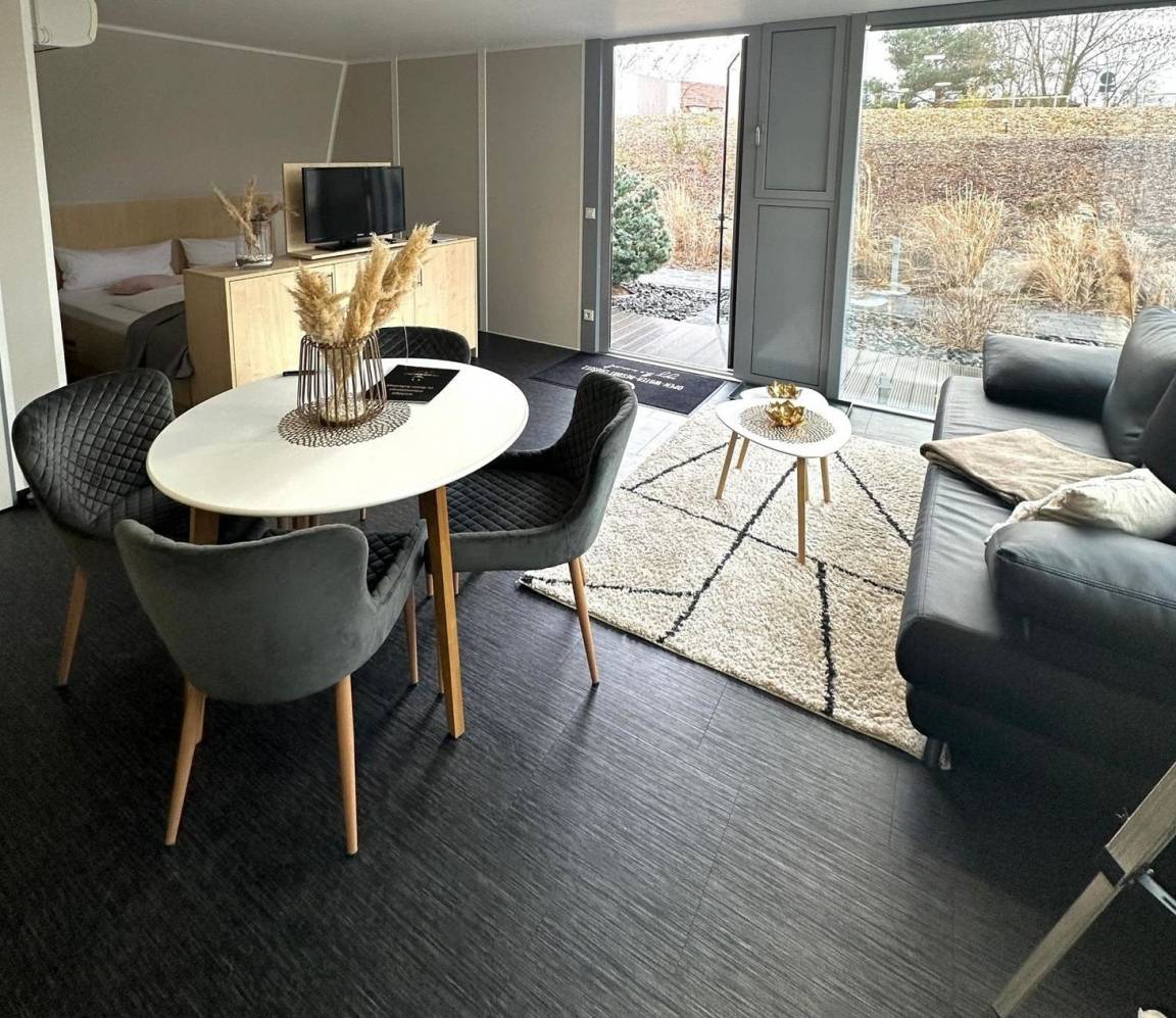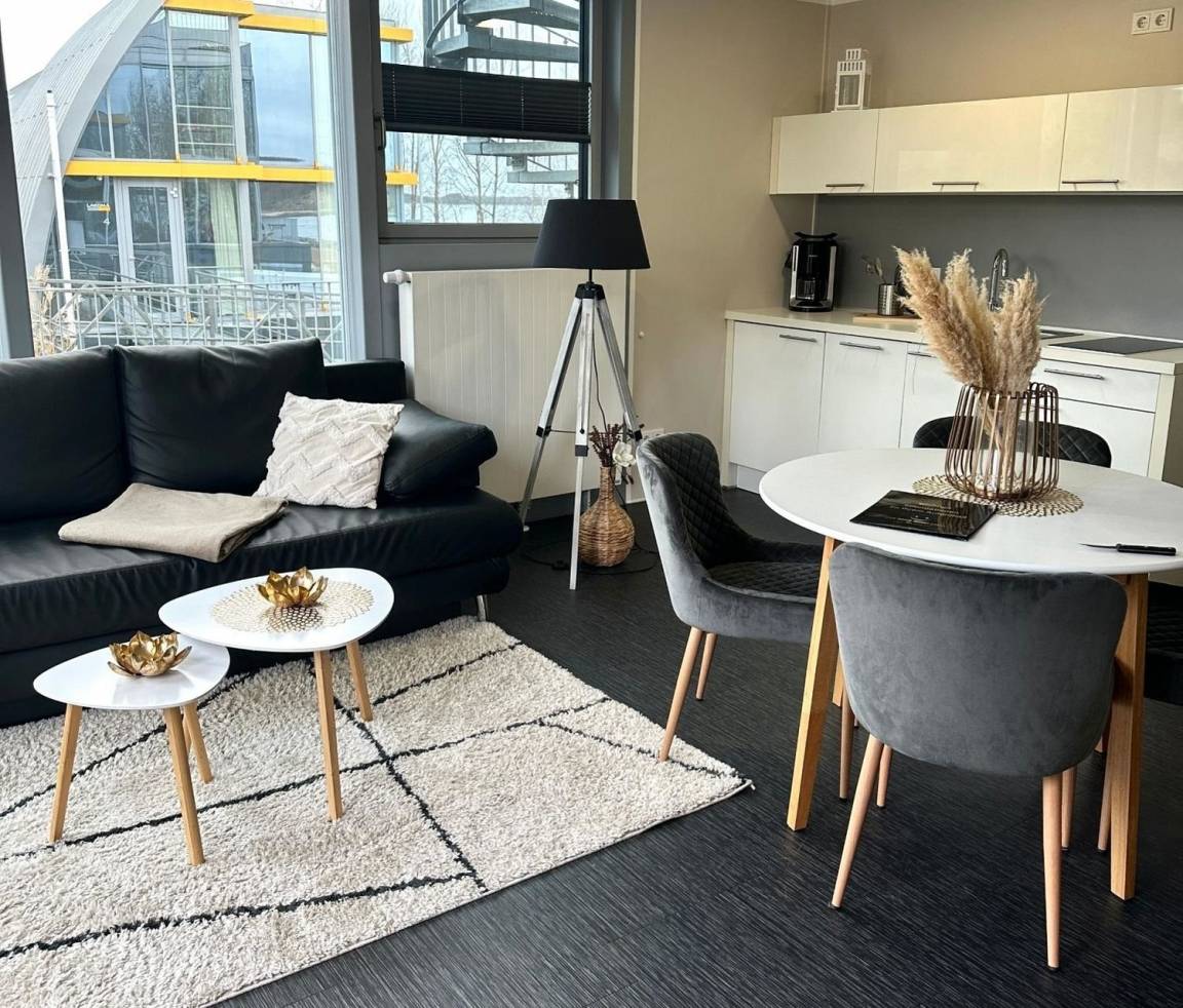 Genießen Sie in unseren komfortablen, geschmackvoll eingerichteten und lichtdurchfluteten Appartements Düne Ihren Aufenthalt im Lausitz Resort. Diese Appartements befinden sich im 1. Obergeschoss des Strandhauses und bieten auf ca. 35 m² Platz für 2 Personen. Ausstattungsmerkmale:Wohn-/Schlafbereich voll klimatisiertDoppelbett im abgegrenzten WohnbereichWohnsofaTV Flachbildschirm mit Radiooffene, voll ausgestattete Küche (Geschirrspüler mit Startpaket, Kühlschrank, 2 Ceran - Kochfelder, Bistroofen, Kaffeemaschine, Wasserkocher), diverse KüchenutensilienBadezimmer mit Dusche/WC, Schminkspiegel und Föhnausgestattet mit Bettwäsche und Handtücher Sonnenterrasse mit Sonnenliegen und EssbereichWLAN inklusiveein kostenfreier PKW-StellplatzHundemitnahme nur unter Voranmeldung möglich