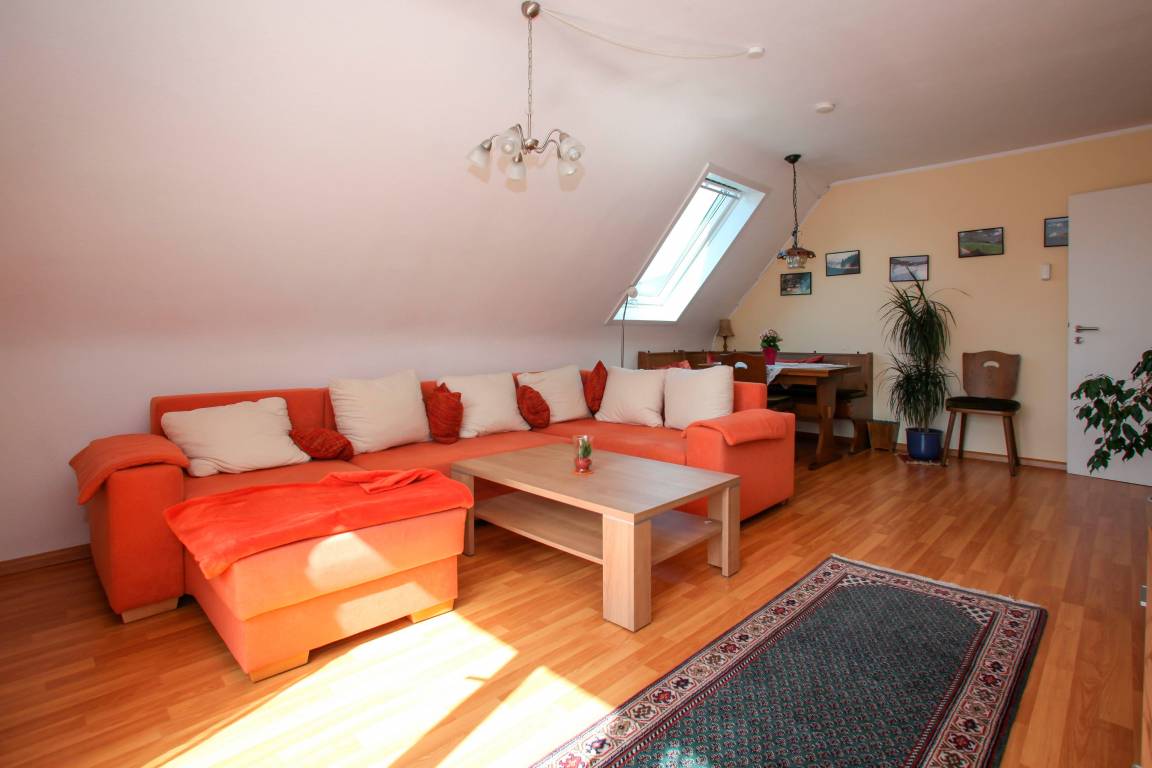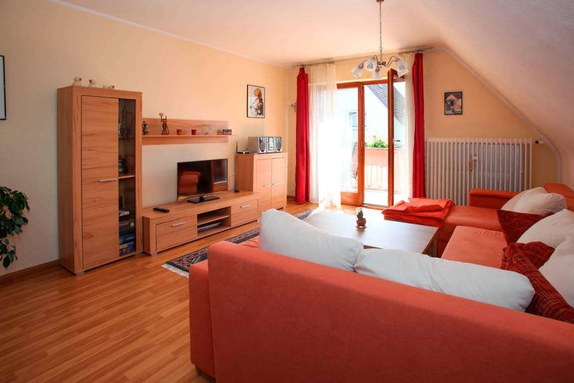 Die Ferienwohnung ist sehr hell, stilvoll und liebevoll eingerichtet. Das gemütliche Wohnzimmer lädt zu entspannten Abendstunden auf unserer bequemen Couch ein. Für Ihre Unterhaltung steht ein Fernseher für Sie bereit.
