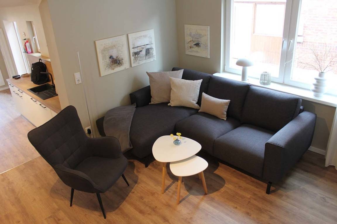 Die Ferienwohnung "Ebbe" liegt im Erdgeschoss und bietet auf 55 Quadratmetern Platz für zwei Personen. Die Mindestaufenthaltsdauer beträgt fünf Übernachtungen. Die Wohnung ist nicht barrierefrei.
