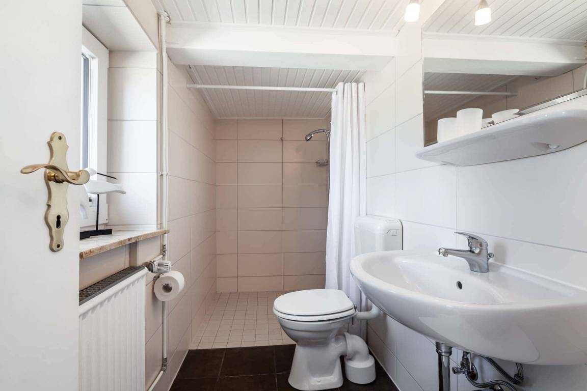Das Ferienhaus 'Reetsommer' verfügt über ein großzügiges Tageslichtduschbad mit WC, und eine Waschmaschine im Flur.