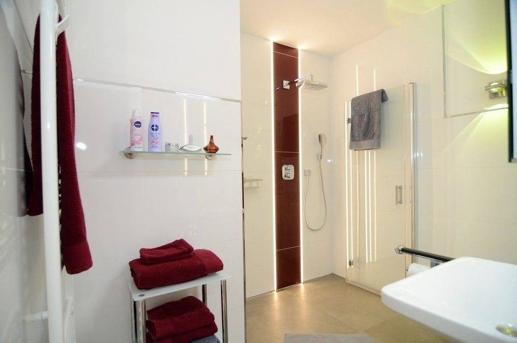 1 Dusche mit Duschpaneel/Duschsäule und LED Beleuchtung und frei verstellbarer Duschwand