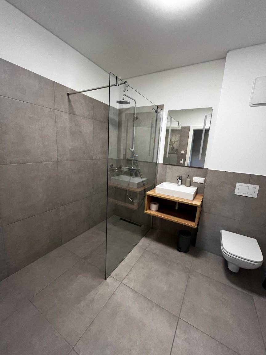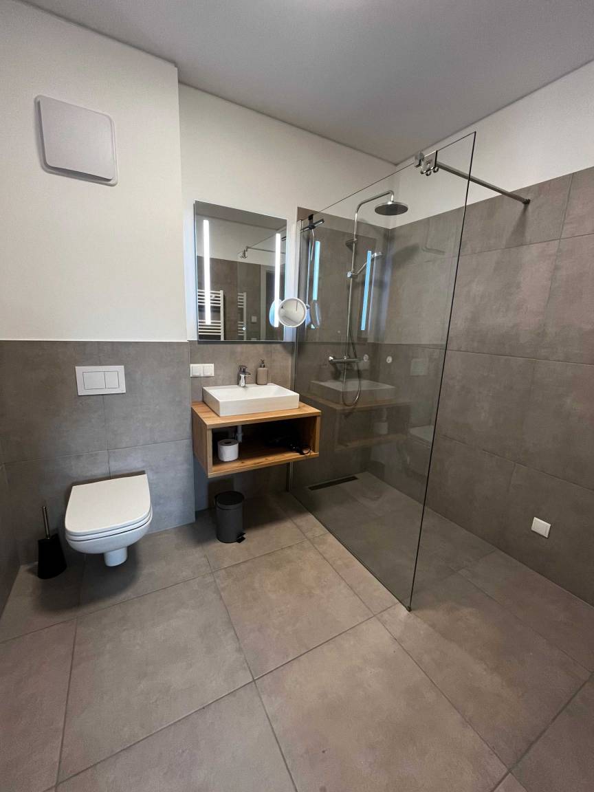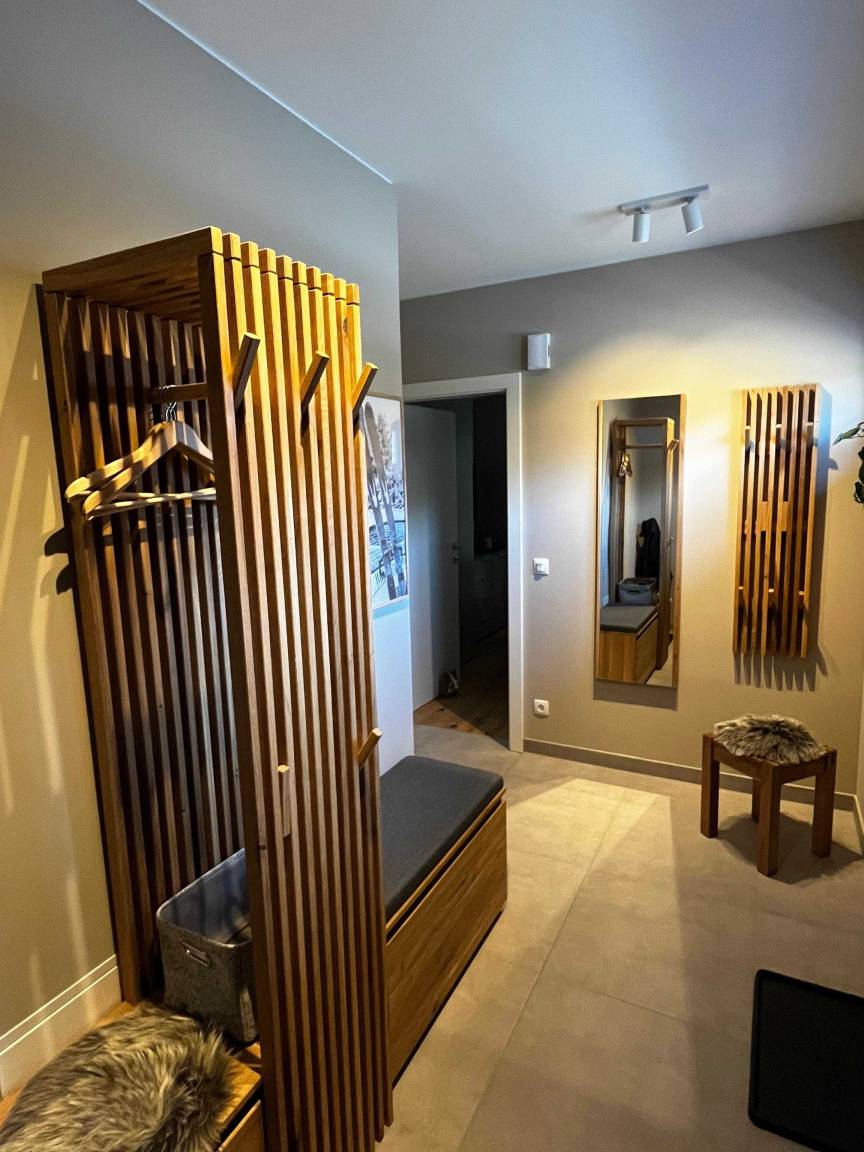 This stylish apartment features a spacious living area complete with a pull-out sofa, a fully equipped kitchen and a large dining table – ideal for spending time together and enjoying relaxed evenings.