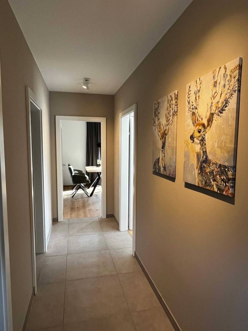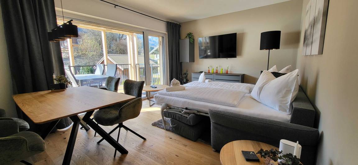 Das stilvolle Apartment überzeugt mit einem großzügigen Wohnbereich samt ausziehbarer Couch, einer voll ausgestatteten Küche sowie einem großen Esstisch – ideal für gemeinsame Stunden und entspannte Abende.