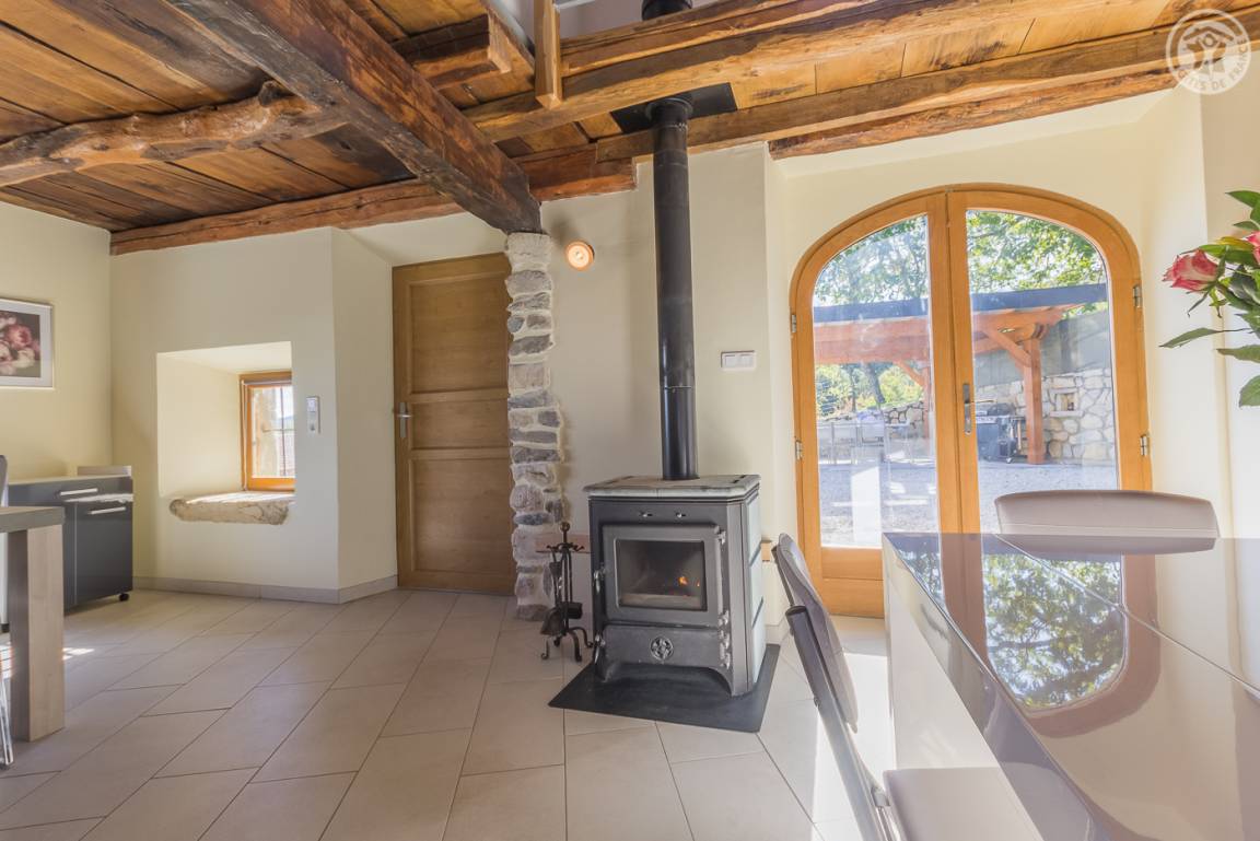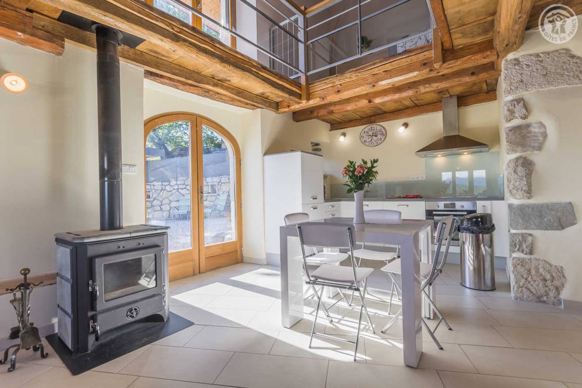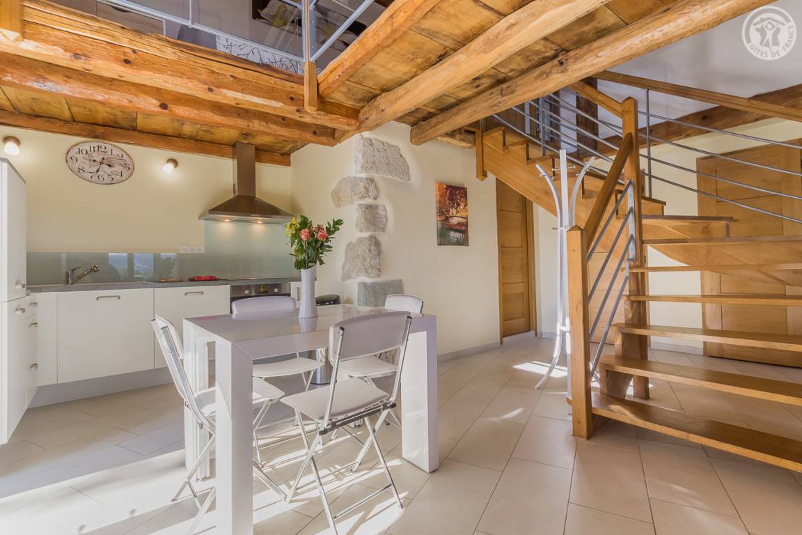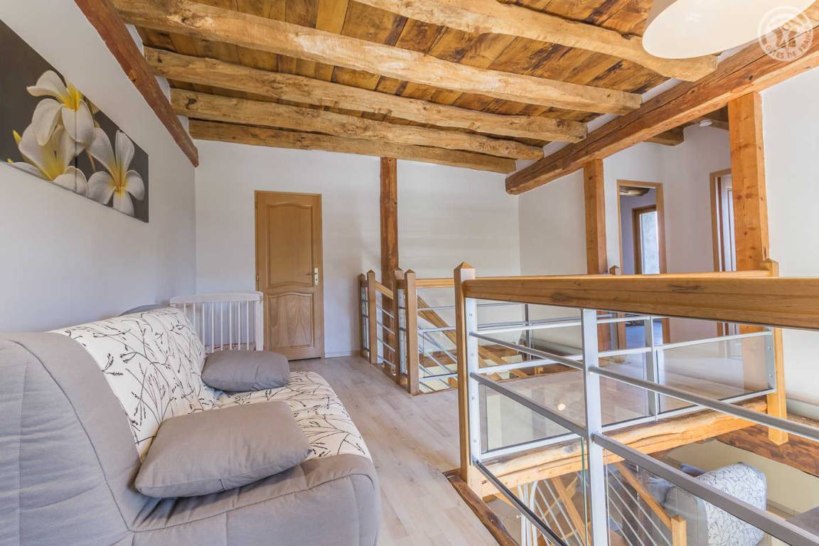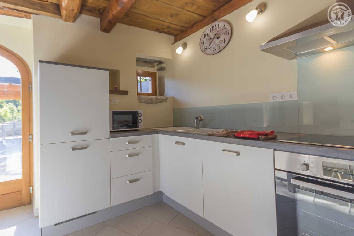 Freistehendes Haus auf 2 Ebenen. Großes Grundstück mit überdachter Terrasse und ausgestattet mit einer Sommerküche (Handwaschbecken, Grill und Außengeschirr). Erdgeschoss: Wohnküche mit Holzofen. Wäschekammer. Separates WC mit Handwaschbecken. Badezimmer (Dusche). Obergeschoss: 2 Schlafzimmer mit Ostbalkonzugang (1 Schlafzimmer mit 1 Doppelbett 160 x 200 cm/ 1 Schlafzimmer mit 1 Doppelbett 160 x 200 cm mit eigenem Duschbad und WC im Schlafzimmer). Zum Wohnzimmer hin offenes Zwischengeschoss mit Sofa, das in ein Bett für 2 Personen umgewandelt werden kann (140 x 190 cm). Separates WC mit Handwaschbecken. Bettwäsche und Handtücher inklusive, Betten bei Ankunft bezogen. Reinigungspaket optional erhältlich.