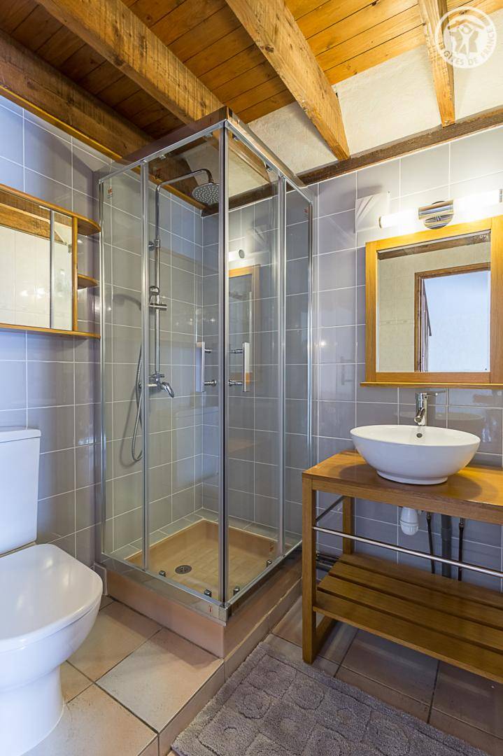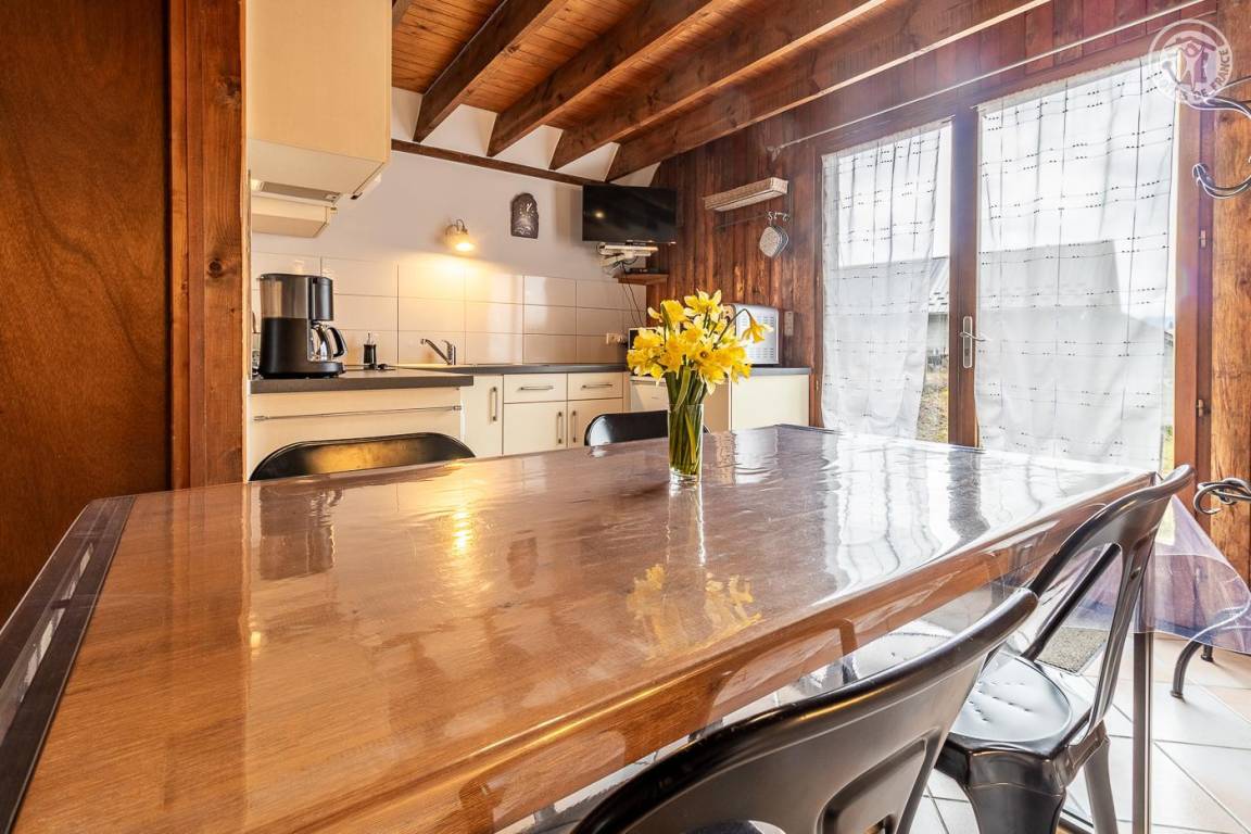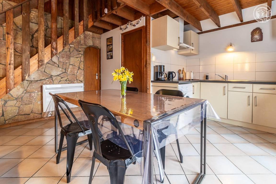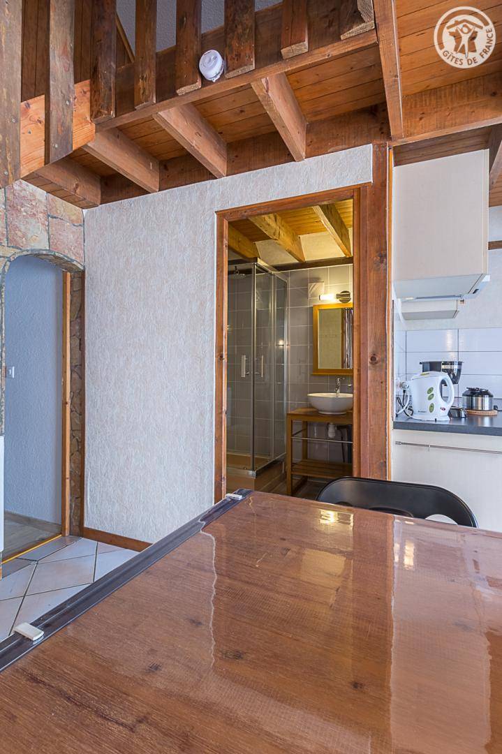 Doppelhaushälfte, angrenzend an das Haus des Eigentümers. Unabhängiger Zugang über die Terrasse (2 Holzstufen): Wohnküche, Badezimmer (Dusche und WC), 1 Schlafzimmer (1 Doppelbett 140x190 cm). 1. Stock: Schlafzimmer im Zwischengeschoss (3 m², Carrez-Recht) mit 1 Einzelbett 90 x 190 cm. Terrasse und Privatgrundstück. Privater Parkplatz (1 Platz). Bettwäsche inklusive, Betten gemacht. Gesamte Wohnfläche inkl. Dachgeschoss: 45m².