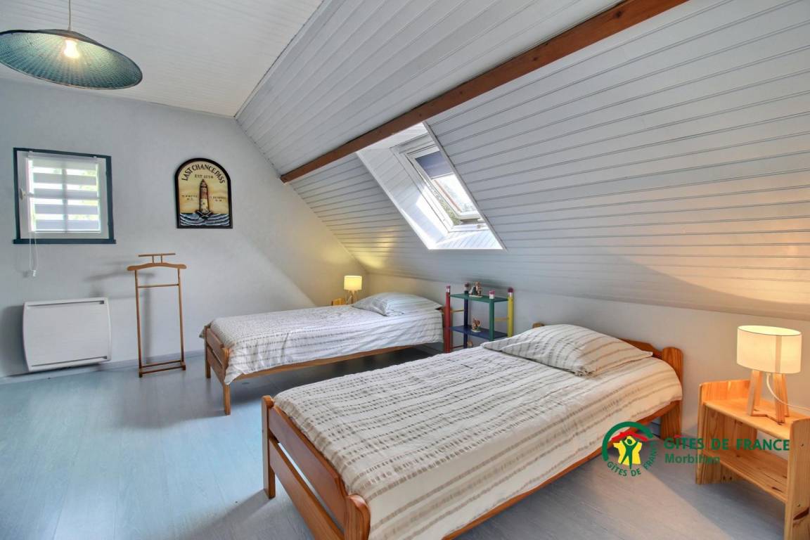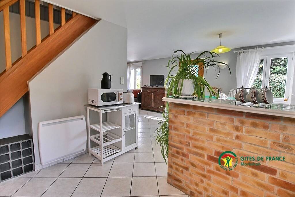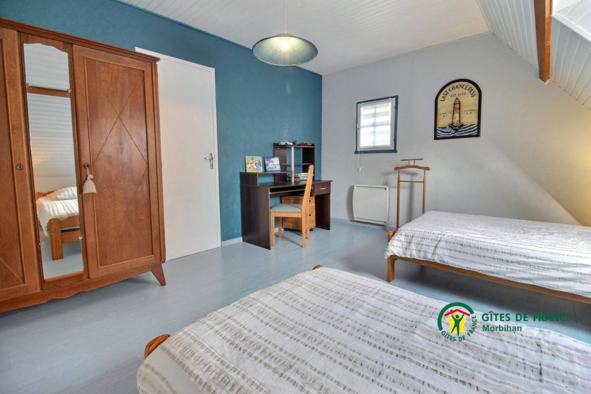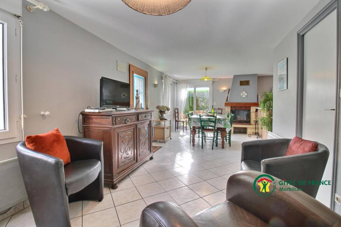 Gite with an enclosed garden 300 m² near a crêperie (pancakes restaurant) 300 m from ERDEVEN. Living room with fireplace (woodburner)/kitchen corner/sitting area, 3 bedrooms (2 double and 2 single beds, baby cot), bathroom, shower, 2 WC. Electric heating. Cupboards upstairs. Terrace facing south-west, garden furniture, swing and garage. Stone built BBQ. Path touring the array of megaliths at 200m and the sea at 5 minutes. You'll enjoy both the nearby sea and countryside with endless footpaths and rambles in a flowery and peaceful countryside. Short stays from 3 nights.