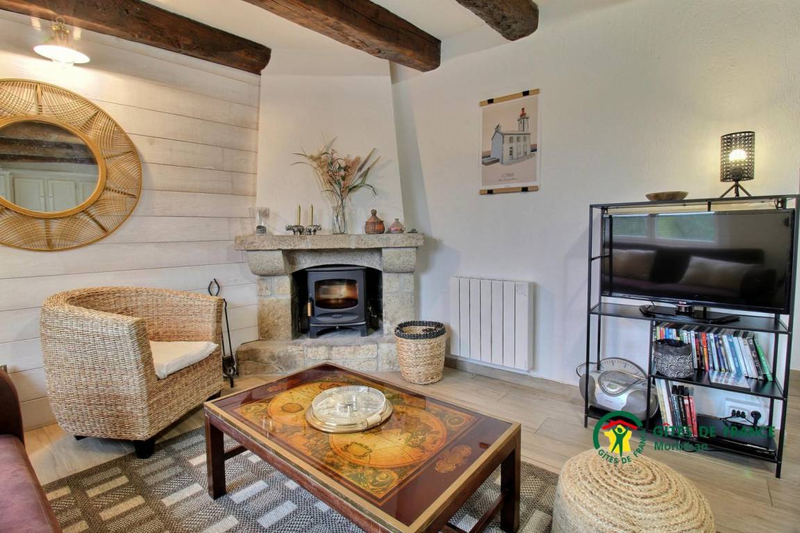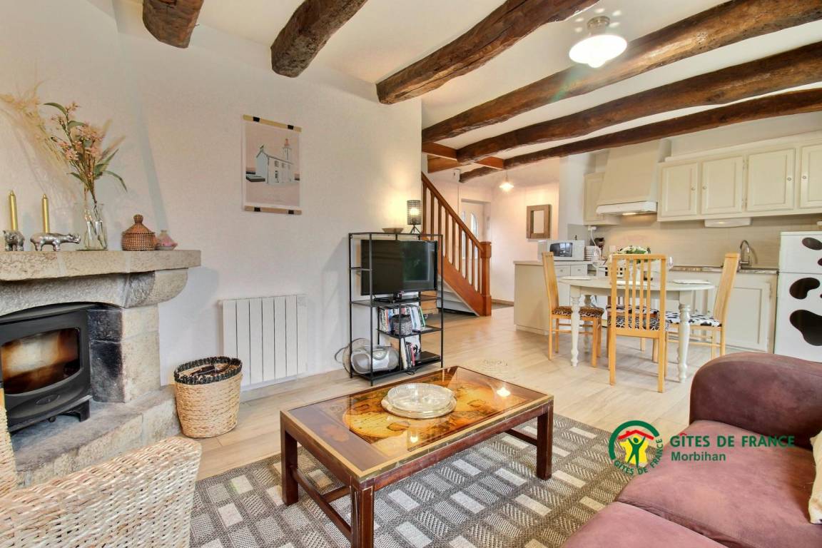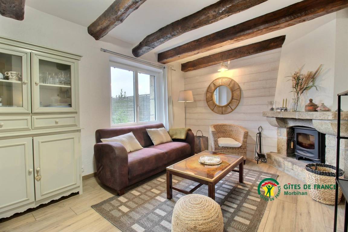 Dieses Steinferienhaus besteht im Erdgeschoss aus einem zum Wohn-/Wohnzimmer offenen Küchenbereich mit Kamin (das erste Feuer ist kostenlos), sowie einem Badezimmer und einer separaten Toilette. Im Obergeschoss befinden sich zwei Schlafzimmer, das erste mit einem 160x200-Bett, das zweite mit einem 140x190-Bett, ein Badezimmer mit Toilette. Draußen genießen Sie eine geschlossene Südterrasse sowie einen privaten, nach Norden ausgerichteten Innenhof mit Gartenmöbeln, Grill und Liegestühlen. Vermietung angrenzendes Ferienhaus 56G54145. Zur Mitbenutzung: Ein angrenzendes Grundstück von 1.000 m² mit Portikus. Ein Platz für ein Fahrzeug.