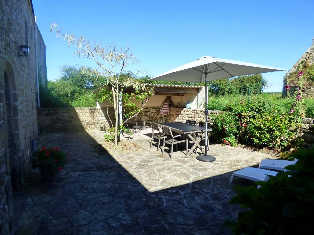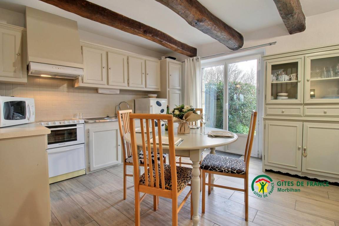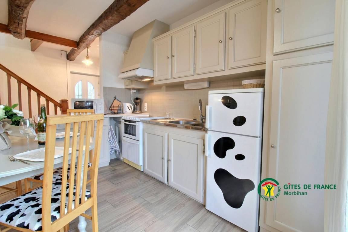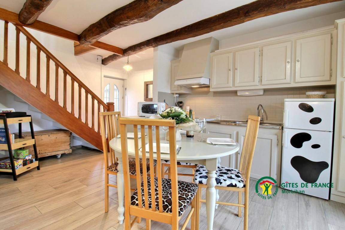 Dieses Steinferienhaus besteht im Erdgeschoss aus einem zum Wohn-/Wohnzimmer offenen Küchenbereich mit Kamin (das erste Feuer ist kostenlos), sowie einem Badezimmer und einer separaten Toilette. Im Obergeschoss befinden sich zwei Schlafzimmer, das erste mit einem 160x200-Bett, das zweite mit einem 140x190-Bett, ein Badezimmer mit Toilette. Draußen genießen Sie eine geschlossene Südterrasse sowie einen privaten, nach Norden ausgerichteten Innenhof mit Gartenmöbeln, Grill und Liegestühlen. Vermietung angrenzendes Ferienhaus 56G54145. Zur Mitbenutzung: Ein angrenzendes Grundstück von 1.000 m² mit Portikus. Ein Platz für ein Fahrzeug.