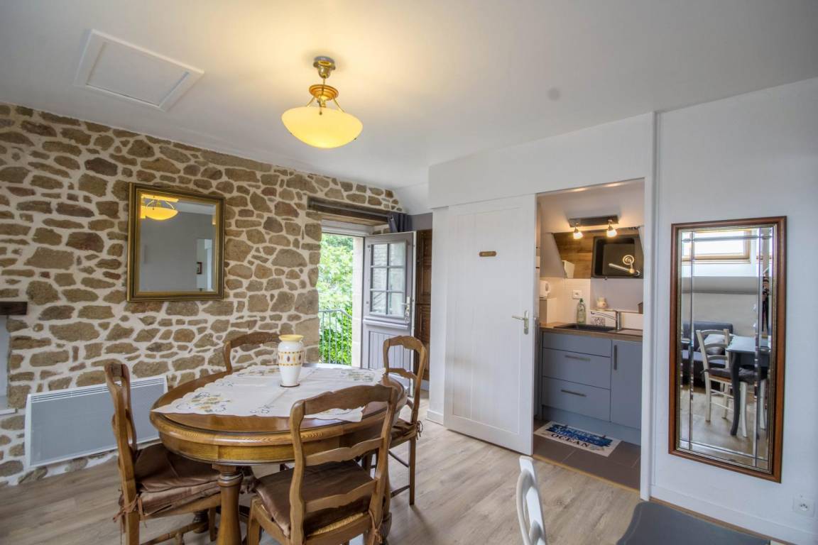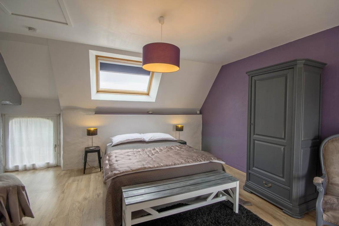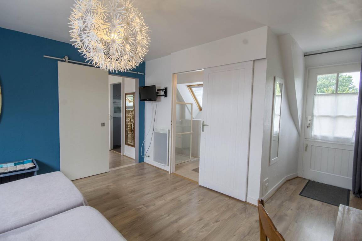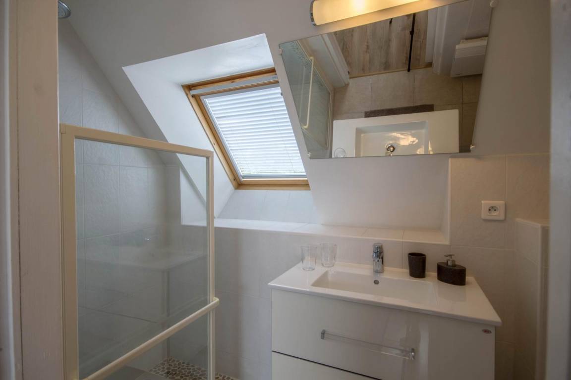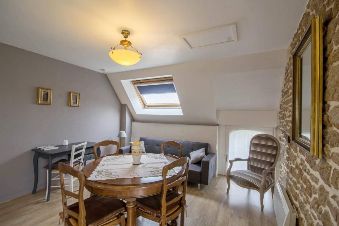 Morbihan, the sea, the rugged coastline... This gite is 4km from the well-known, long, sandy beach of Erdeven and within easy reach of the Gulf of Morbihan, Carnac with its standing stones and the Quiberon peninsula. Enjoy its peaceful location bordered by footpaths, cycle tracks and bridle paths. An upstairs gite for 4 people on the first floor of an 18th century longhouse. Character living room with small kitchen area. Sliding door to Bedroom 1 : twin beds, en-suite shower room with WC. Bedroom 2 (only accessible from outside) : king-size bed, en-suite shower room with WC. Patio with patio furniture and garden shared with ground floor gite no 56G54103. Parking within the property. Use of owner's tumble drier. Please contact owner regarding pets.