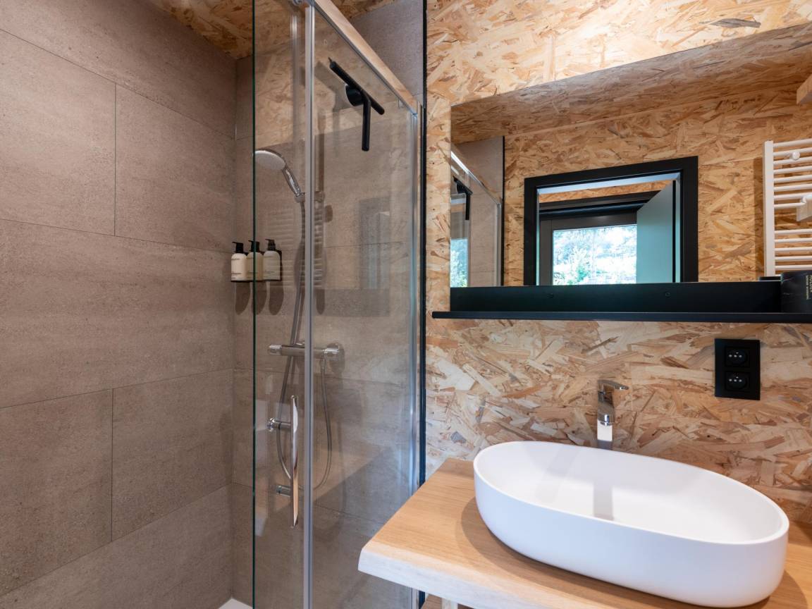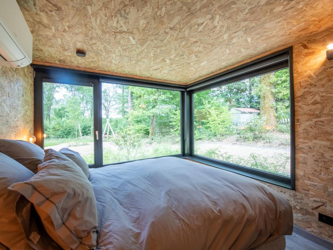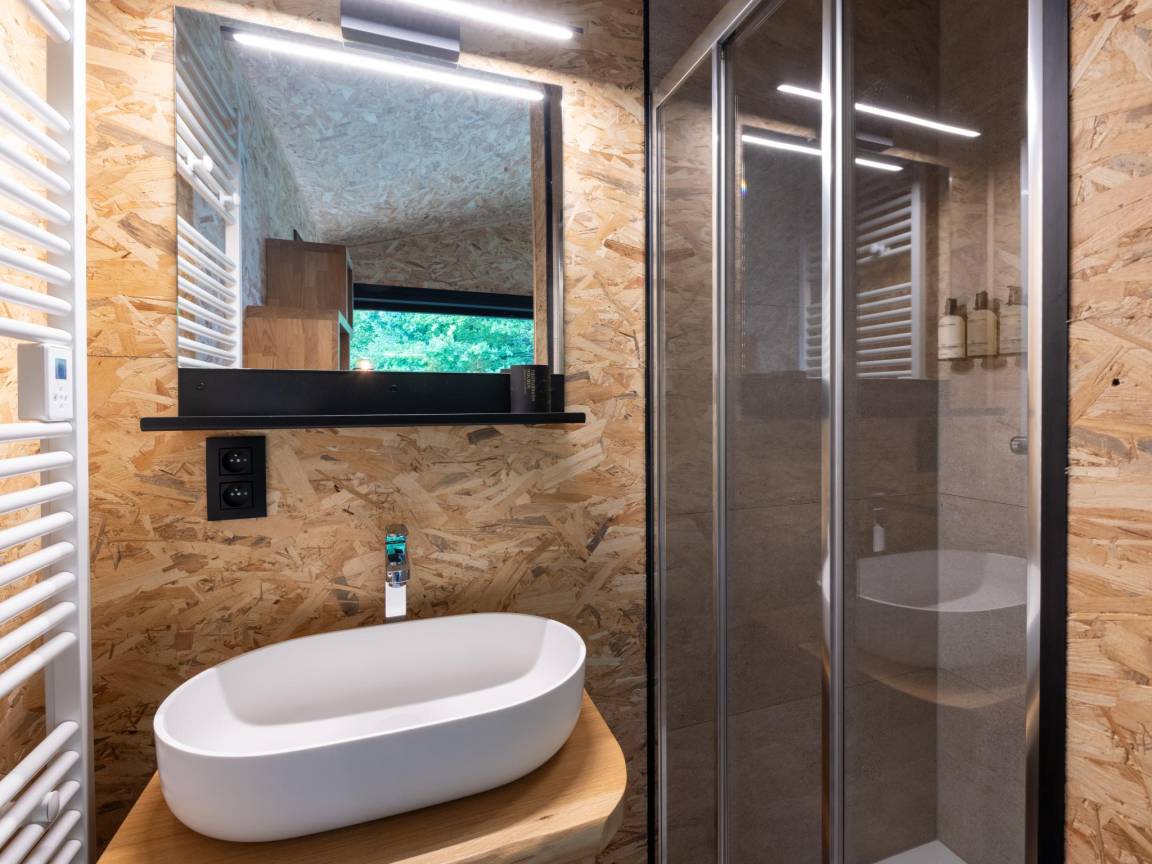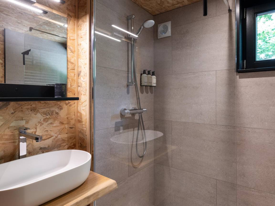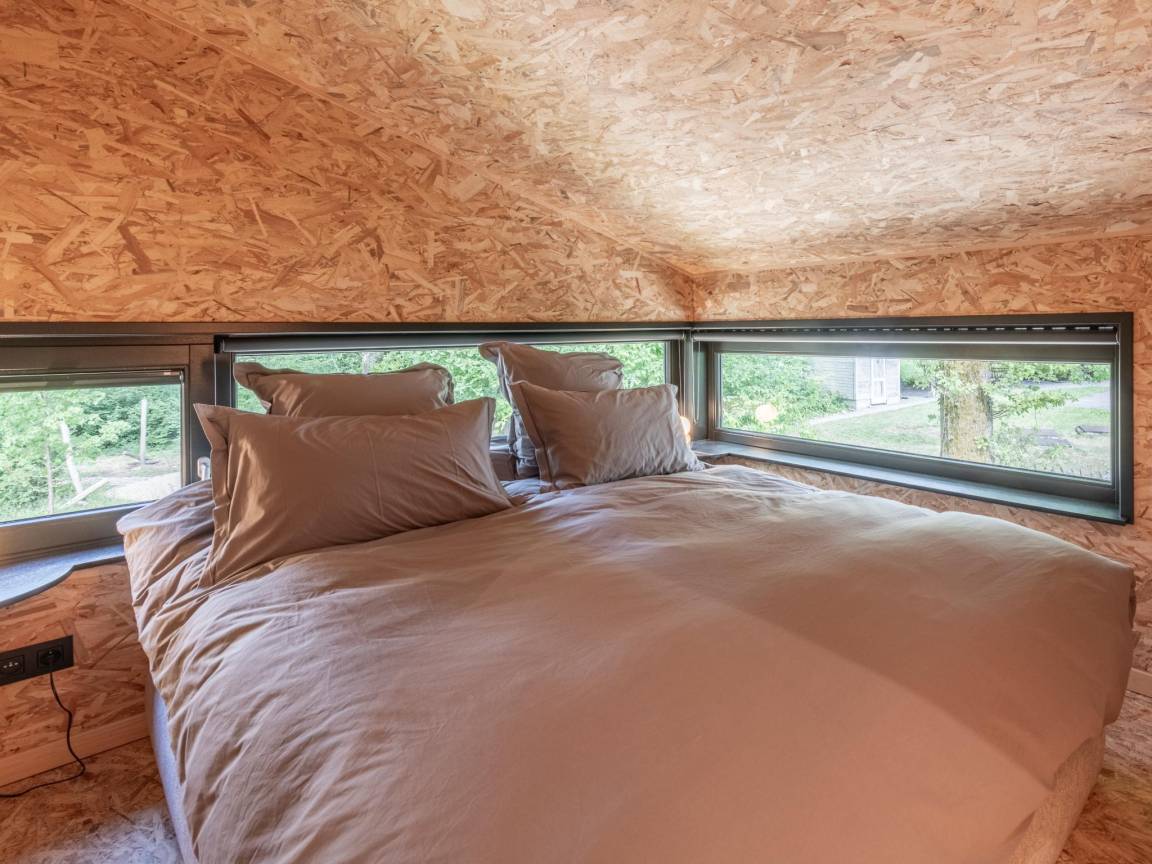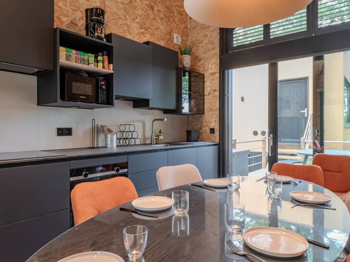 Layout : Parterre: offene Küche mit Kochplatte, Dunstabzugshaube, Kaffeemaschine(Espresso), Backofen, Geschirrspüler, Kühlschrank , Wohn/Esszimmer mit TV(Flatscreen, digital, smart TV), Esstisch, Ofen(Holz), Sitzecke , Schlafzimmer mit Badezimmer(von außen erreichbar) mit Doppelbett, Dusche, Waschbecken, Toilette , Badezimmer mit Dusche, Waschbecken, Toilette , Garten(Gemeinschaftliche Nutzung mit anderen Gästen, angelegt, umzäunt), BBQ(Holzkohle), Boulebahn, Spielgeräte