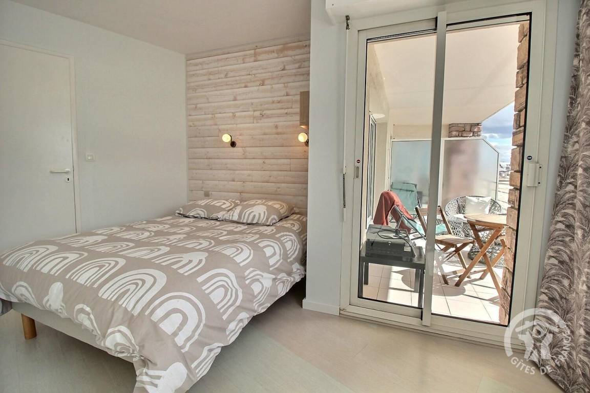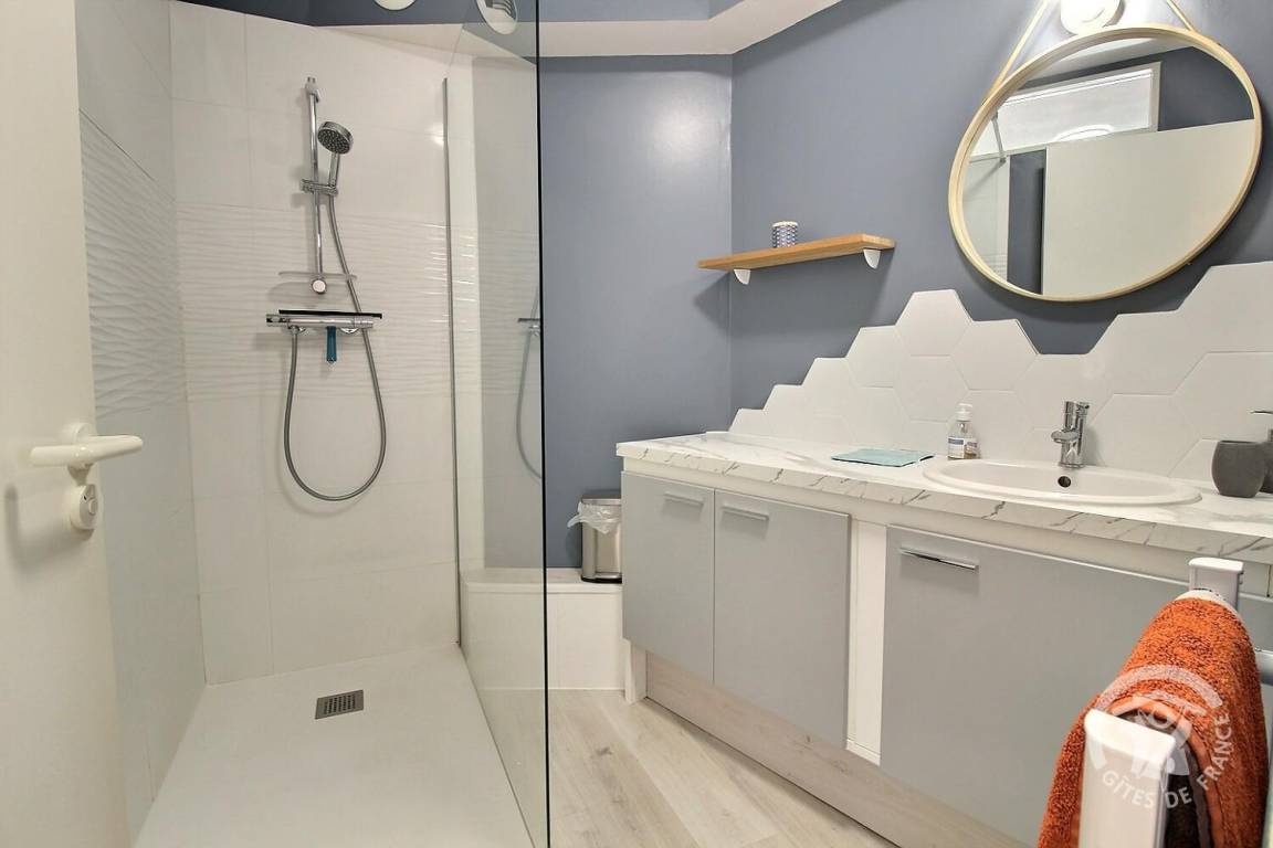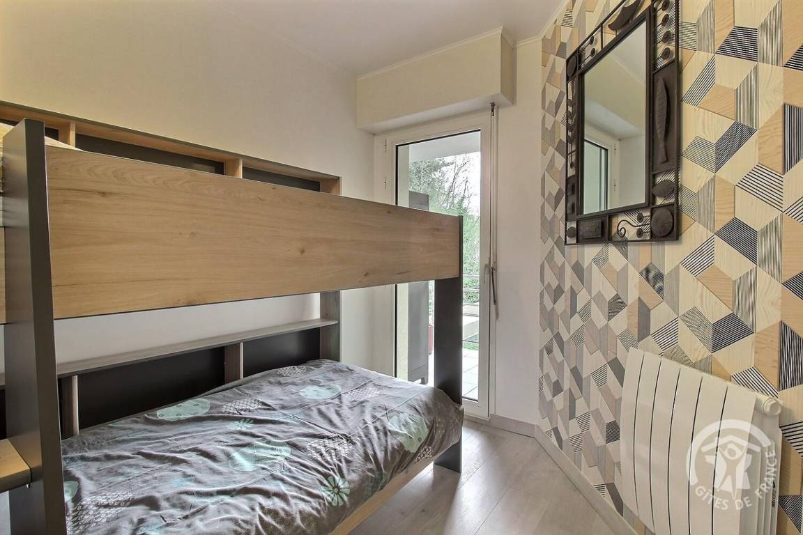 1 Schlafzimmer mit Meerblick (1 Bett 140x200) mit Zugang zu einer Terrasse, Waschküche, ein Badezimmer (ebenerdige Dusche), 1 Schlafzimmer (2 Etagenbetten 90x190), ein weiteres Badezimmer (WC und Waschbecken), ein Schlafzimmer mit Zugang zur Terrasse auf der Rückseite der Residenz (1 Bett 160x200).