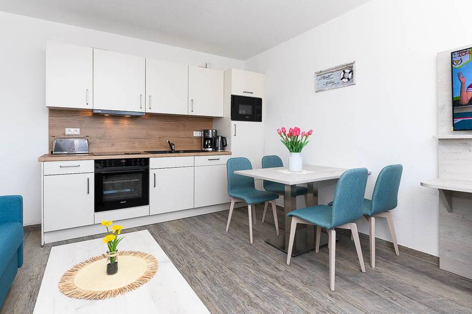 Genießen Sie Ihren Urlaub in vollen Zügen, bei schönem Wetter auch draußen auf der Terrasse. In der gut ausgestatteten Küche finden Sie neben einem Kühlschrank auch eine Mikrowelle und einen Backofen.
