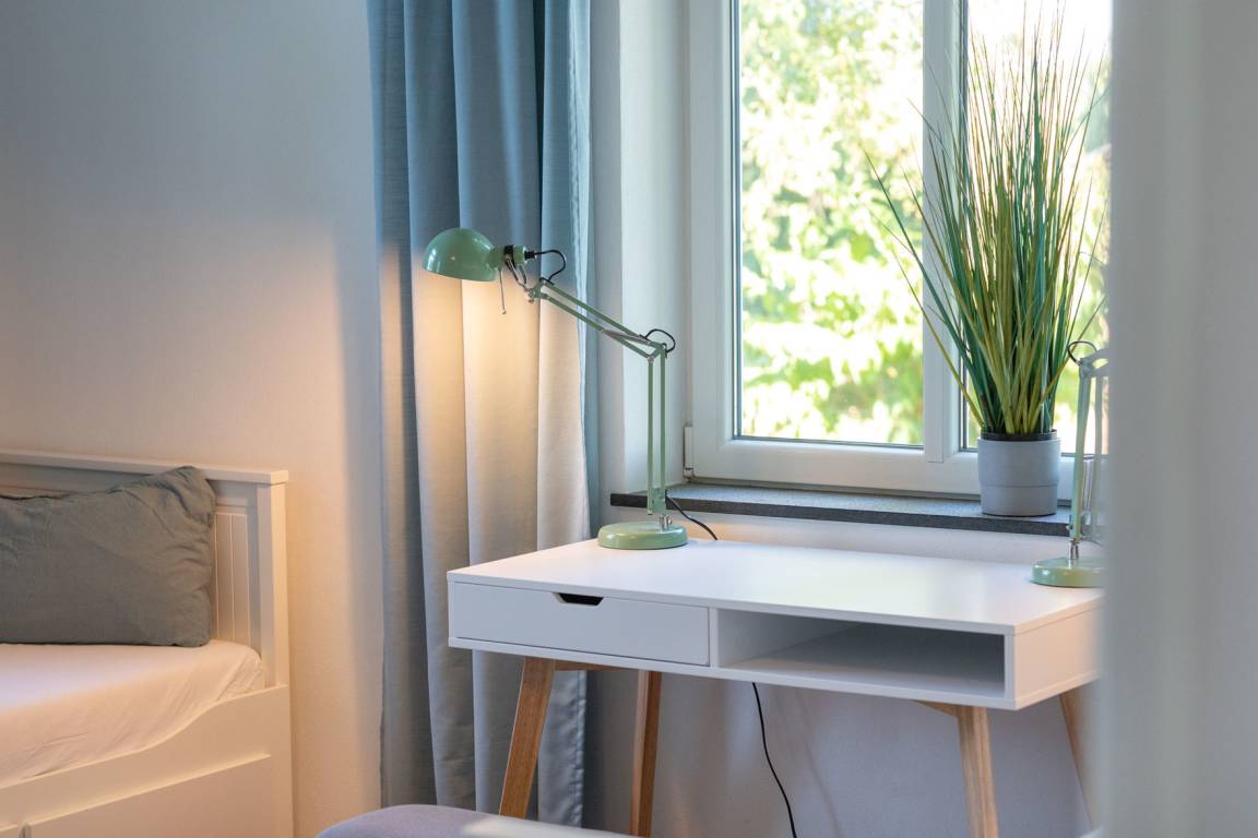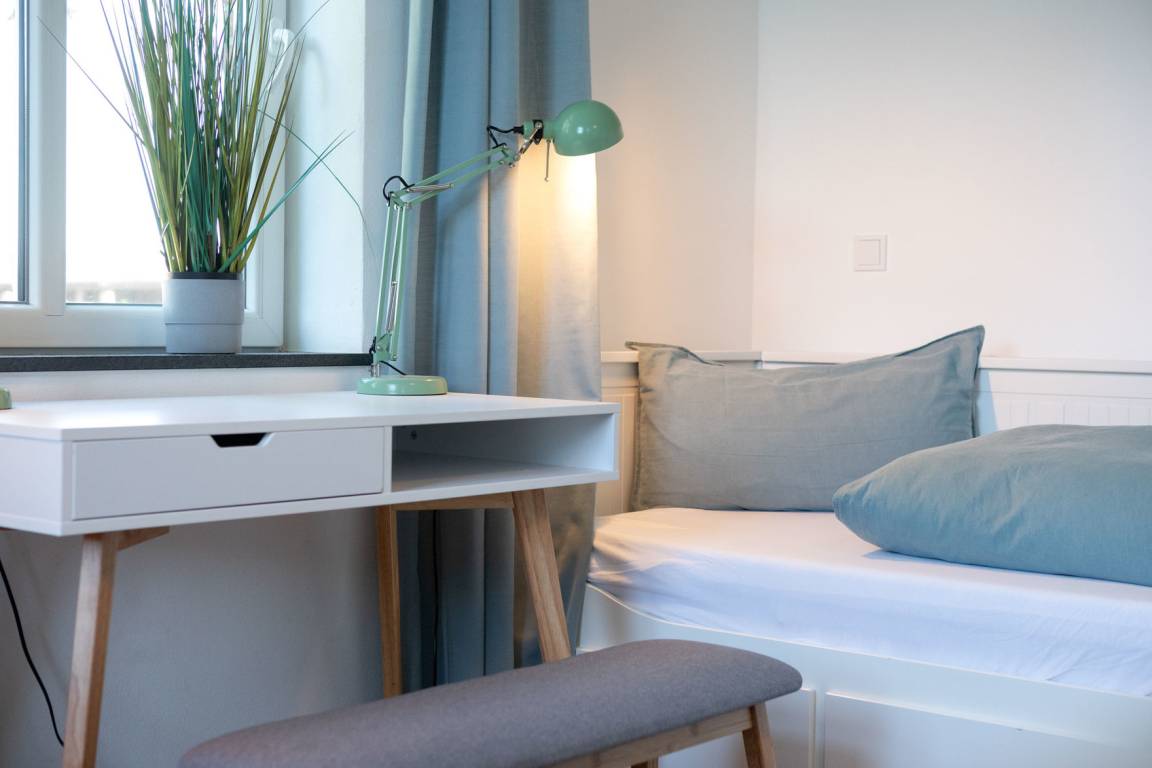 In vier Schlafräumen, davon ein Durchgangszimmer, bieten wir Euch acht Betten (3 Doppel- und 2 Einzelbetten), die zum Einkuscheln und Durchschlafen einladen. Ein Kinderbett kann zusätzlich auf Wunsch gestellt werden. So könnt Ihr mit insgesamt 8 Personen und Kleinkind Urlaub bei uns machen. Noch ein Freund mehr, der unbedingt mit muss? Das Sofa im Wohnraum (120 x 200 cm) ist zum Schlafen geeignet, sagt einfach Bescheid!