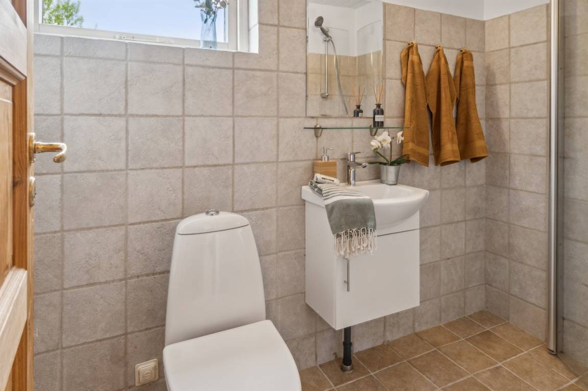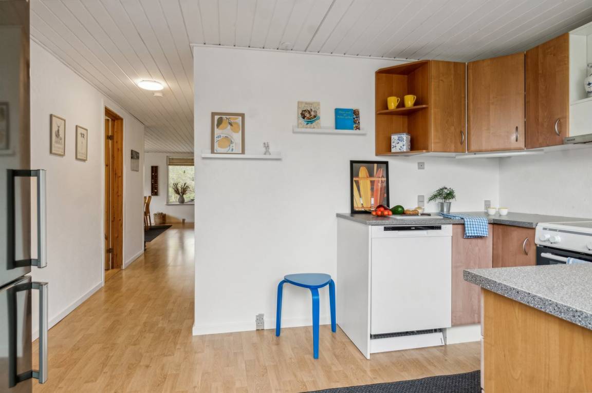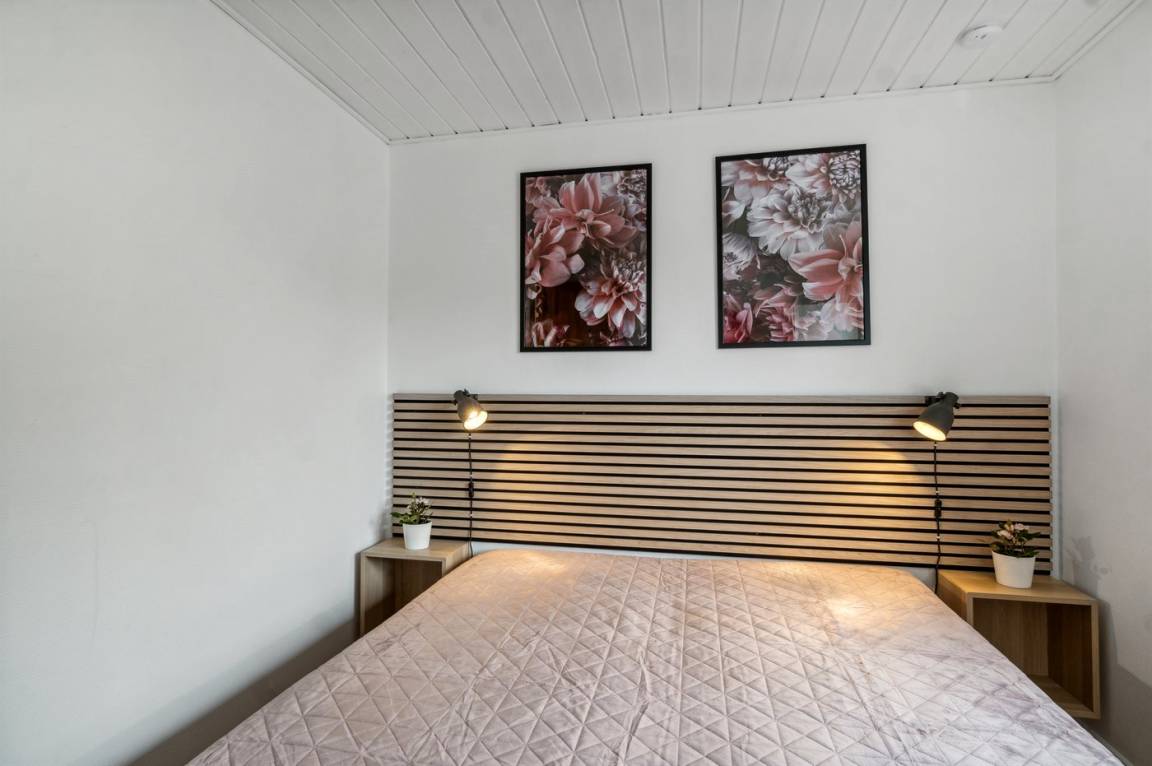 Im Inneren ist das Haus gemütlich mit dem Wohnzimmer und dem Essbereich als natürlicher Treffpunkt. Von hier aus gelangt man zur überdachten Holzterrasse. Das Haus wird energieeffizient mit einer Luft-Luft-Wärmepumpe beheizt, und für gemütliche Stunden gibt es einen Kaminofen. Die Wärmepumpe funktioniert ebenfalls als Aircondition. In der Küche gibt es unter anderem eine Spülmaschine und einen Ausgang zur ostseitigen Terrasse, wo man den Kaffee in der Morgensonne genießen kann. Es gibt 2 Schlafzimmer, beide mit Doppelbett. Das Badezimmer verfügt über eine Duschkabine und Fußbodenheizung. Im Garten mit Rasenfläche gibt es viel Platz zum Spielen und Ballspielen.