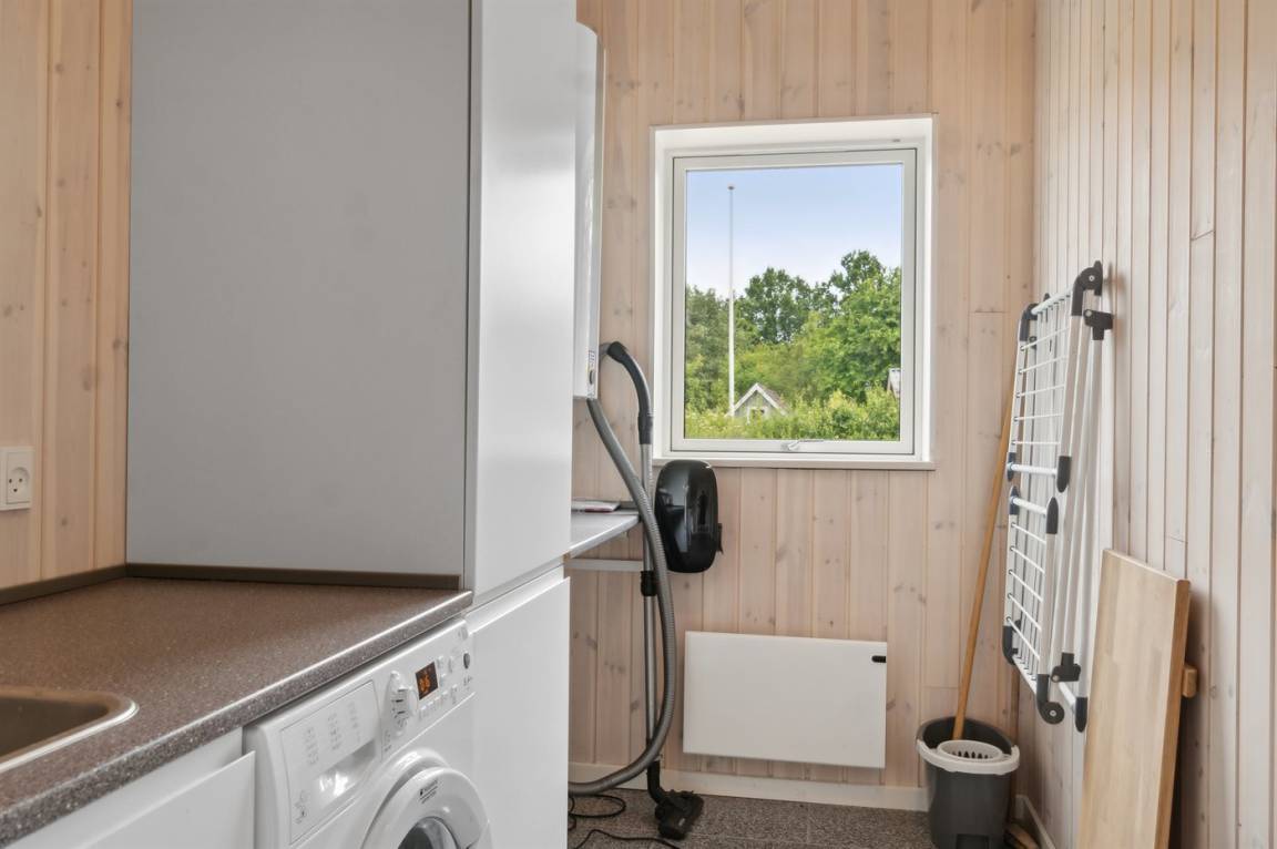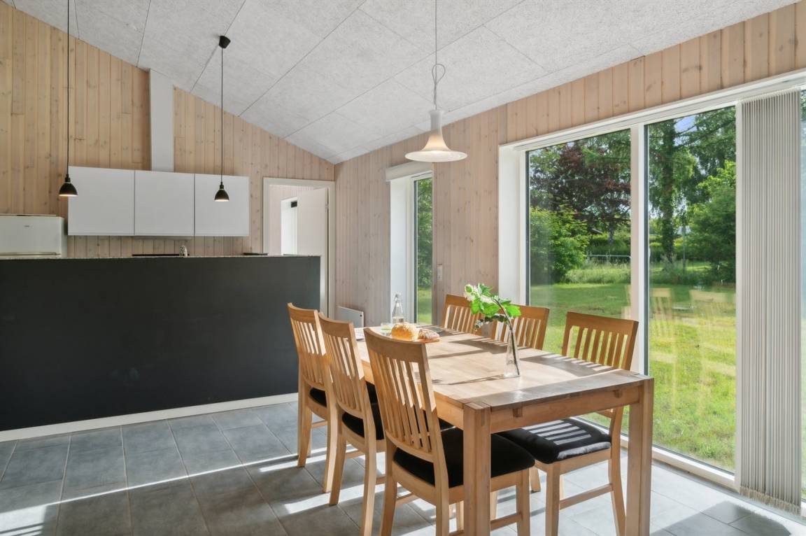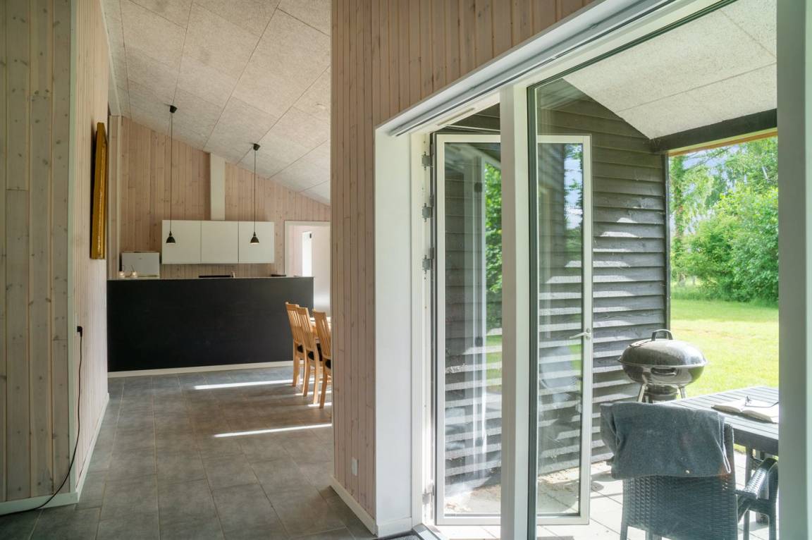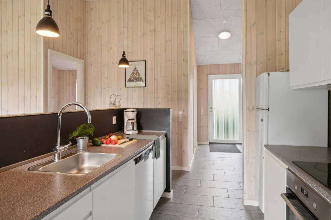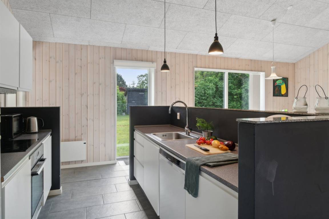 Im Zentrum des Hauses befindet sich das große Küchen- und Wohnzimmer, das den natürlichen Treffpunkt für gemütliches Beisammensein mit Freunden und Familie bildet. Das Haus ist überall hell und geräumig mit Decken bis zum Giebel in allen Zimmern und viel Tageslicht von den großen Fensterfronten. Es gibt 3 gute Schlafzimmer mit jeweils 2 Schlafplätzen. Das Badezimmer verfügt über eine Duschkabine. Im praktischen Hauswirtschaftsraum gibt es eine Waschmaschine. Das Haus wird umweltfreundlich mit einer Luft-Luft-Wärmepumpe beheizt und es gibt Lademöglichkeiten für Elektroautos. Im großen Garten gibt es reichlich Platz zum Spielen und Ballspielen mit den Kindern.