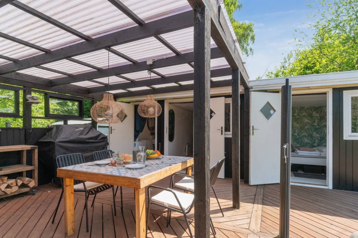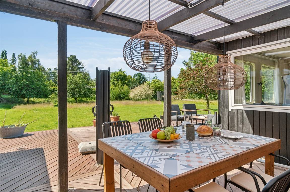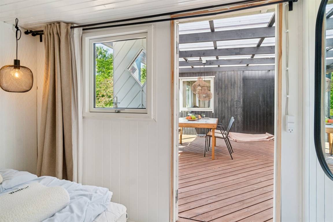 Das Haus ist mit einer gemütlichen Wohnküche eingerichtet, die offen in das Wohnzimmer übergeht – von hier aus gelangst du direkt auf eine große Terrasse, die teilweise überdacht ist. So findest du sowohl Schatten als auch Schutz vor Wind. Im Haupthaus gibt es ein Schlafzimmer mit Doppelbett sowie eine Gästetoilette. Im separaten Gästehaus findest du zwei weitere Schlafzimmer – eines mit Doppelbett, das andere mit einem Einzelbett (120x200 cm). Außerdem befindet sich dort ein Badezimmer mit Duschnische. Eine Waschmaschine steht ebenfalls zur Verfügung.