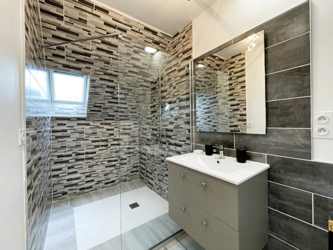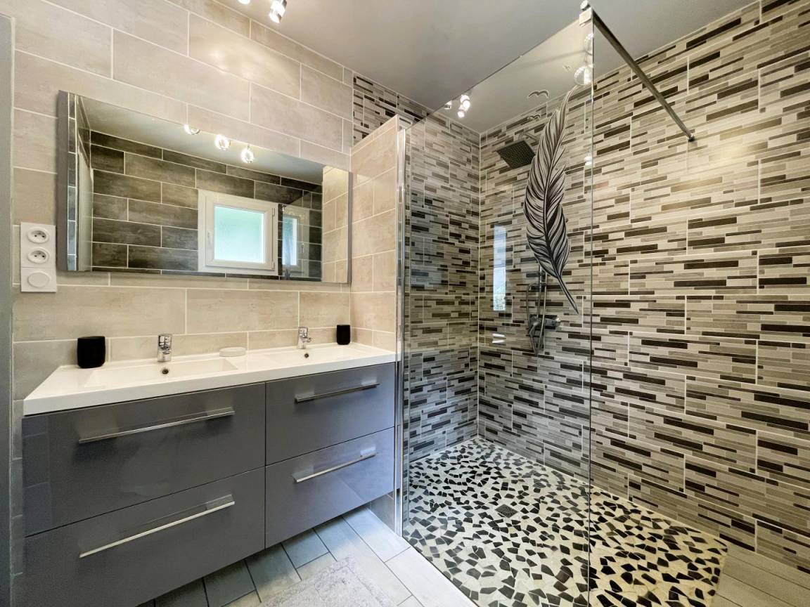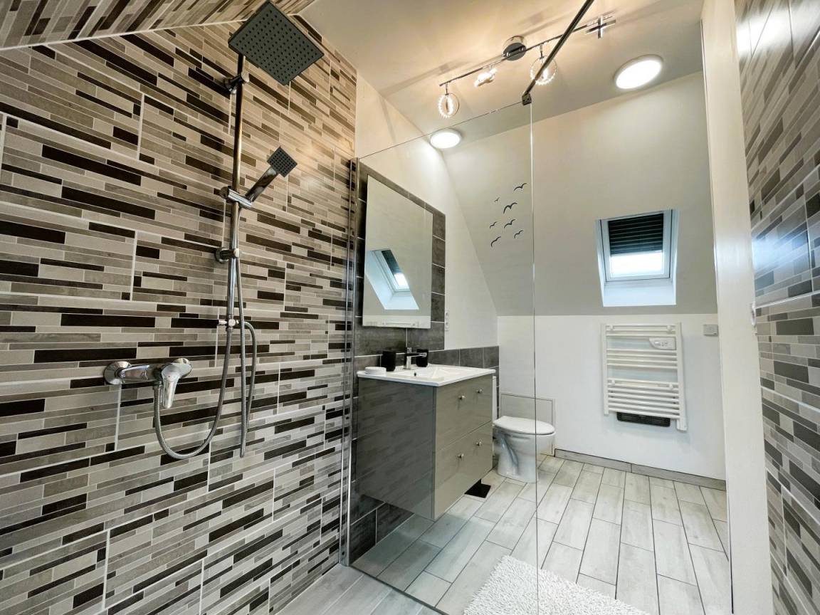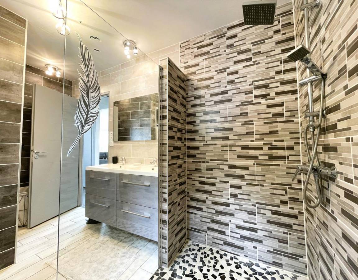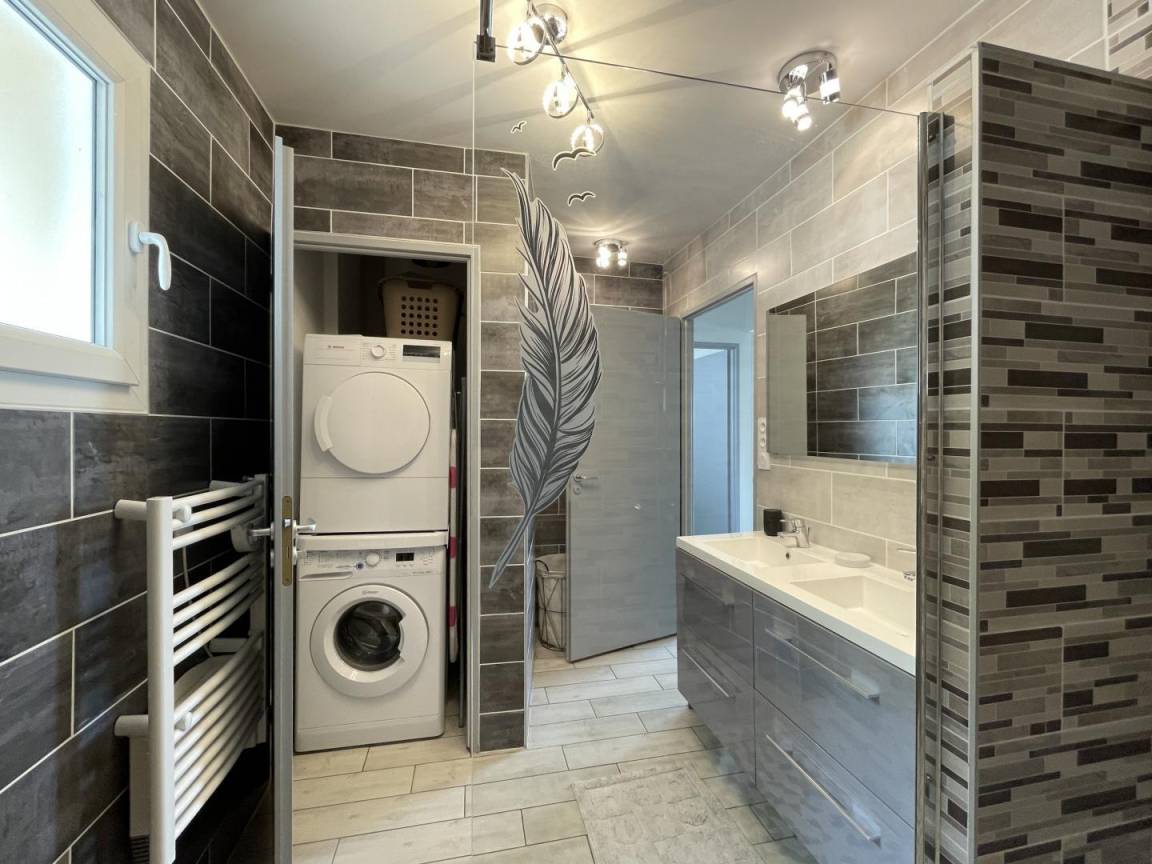 Badezimmer (große ebenerdige Dusche – 2 Waschbecken) – Schrank (Waschmaschine, Trockner). Separates WC.