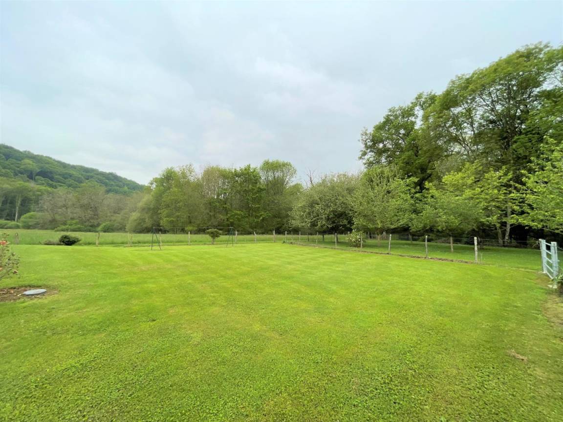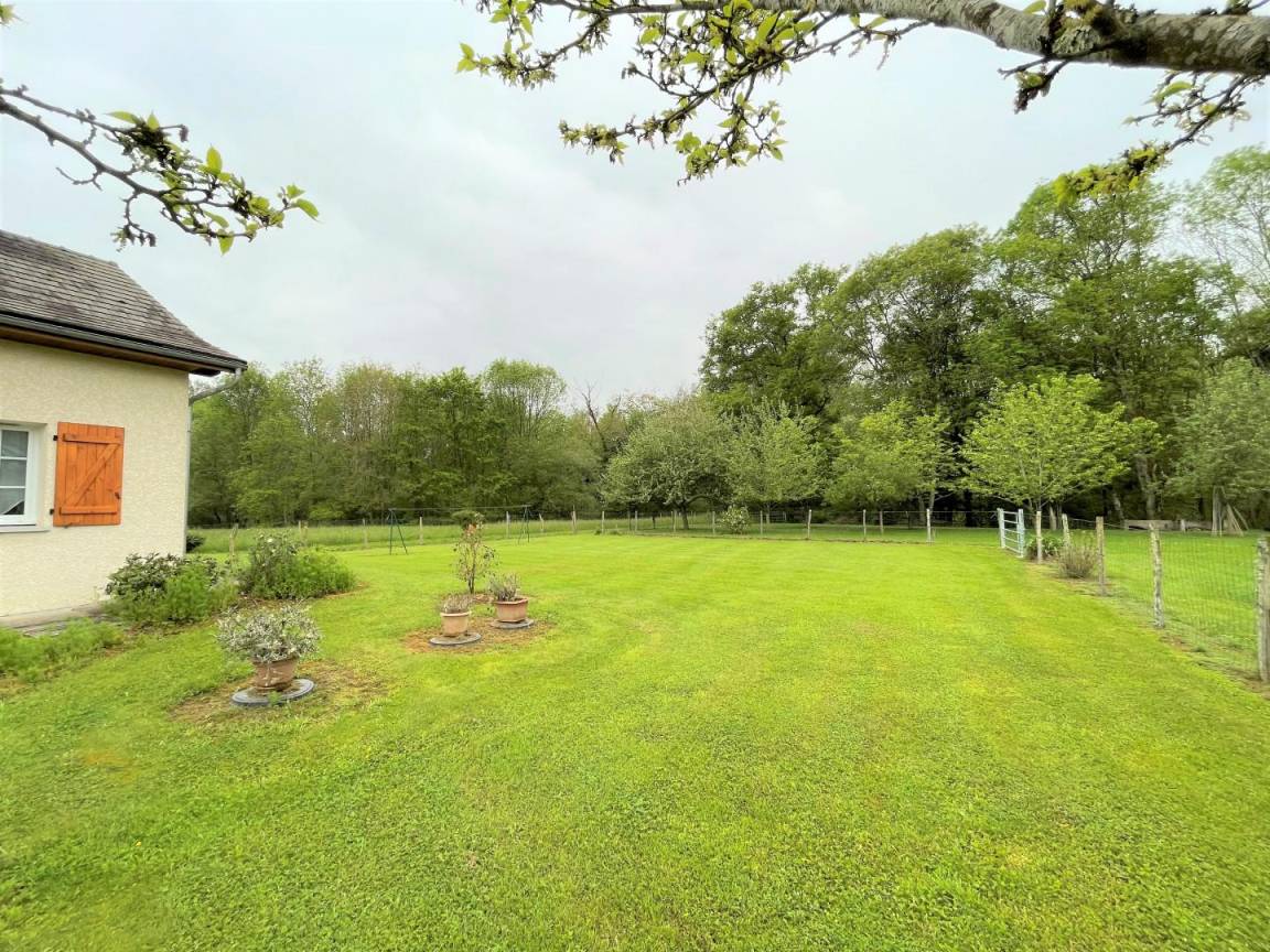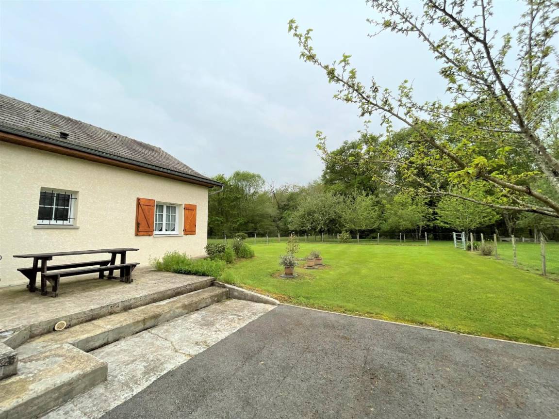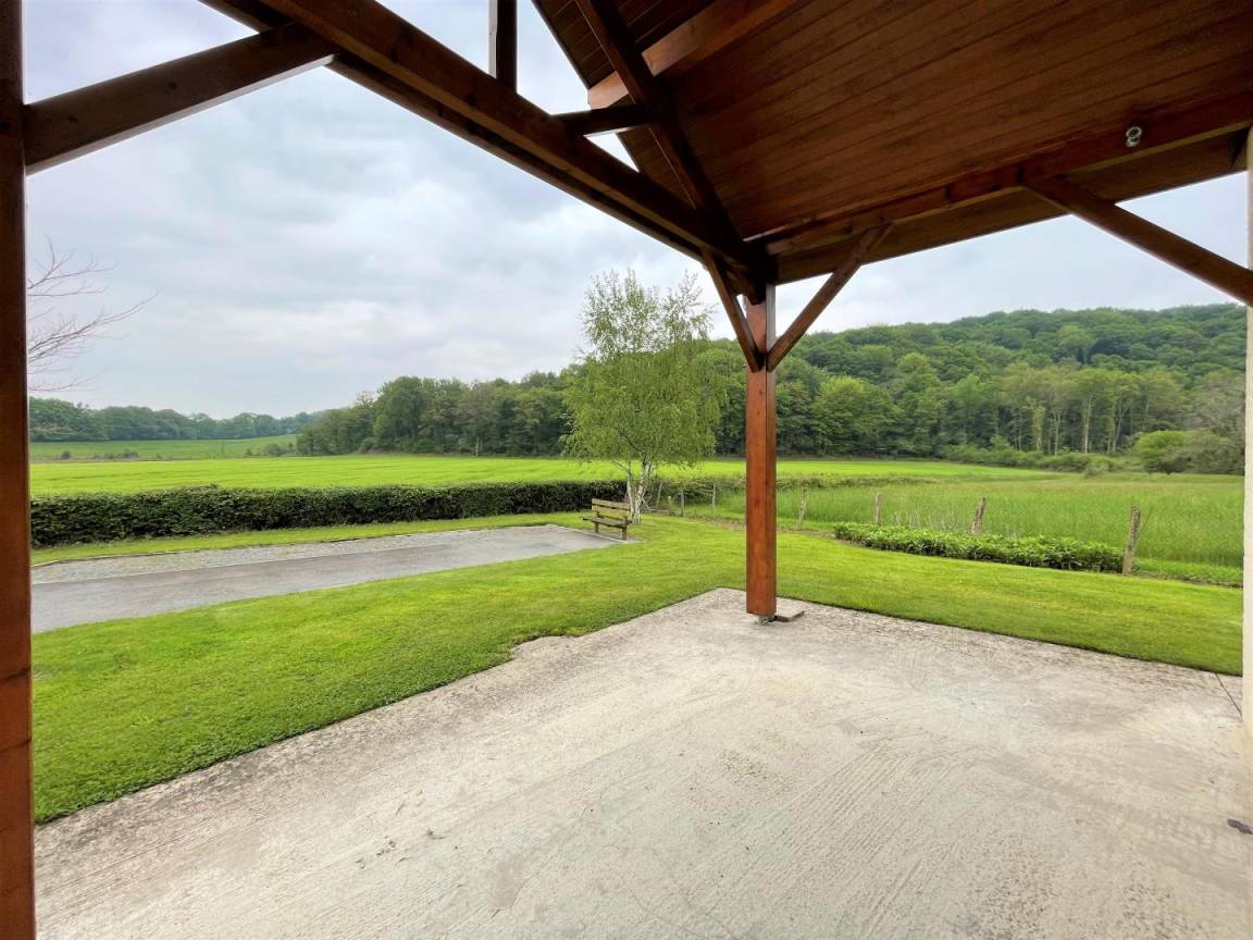 Überdachte Terrasse, eingezäuntes Grundstück von 1500 m², Gartenmöbel, Grill, Sonnenliegen.