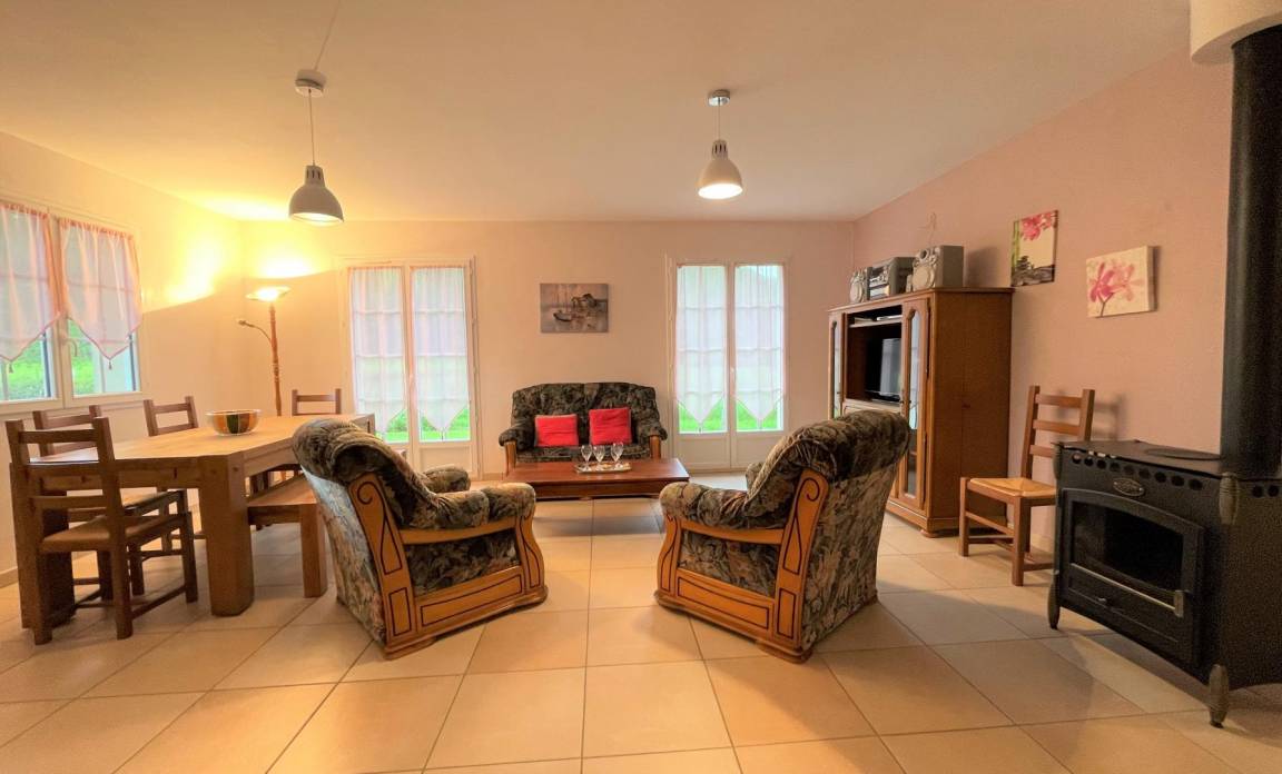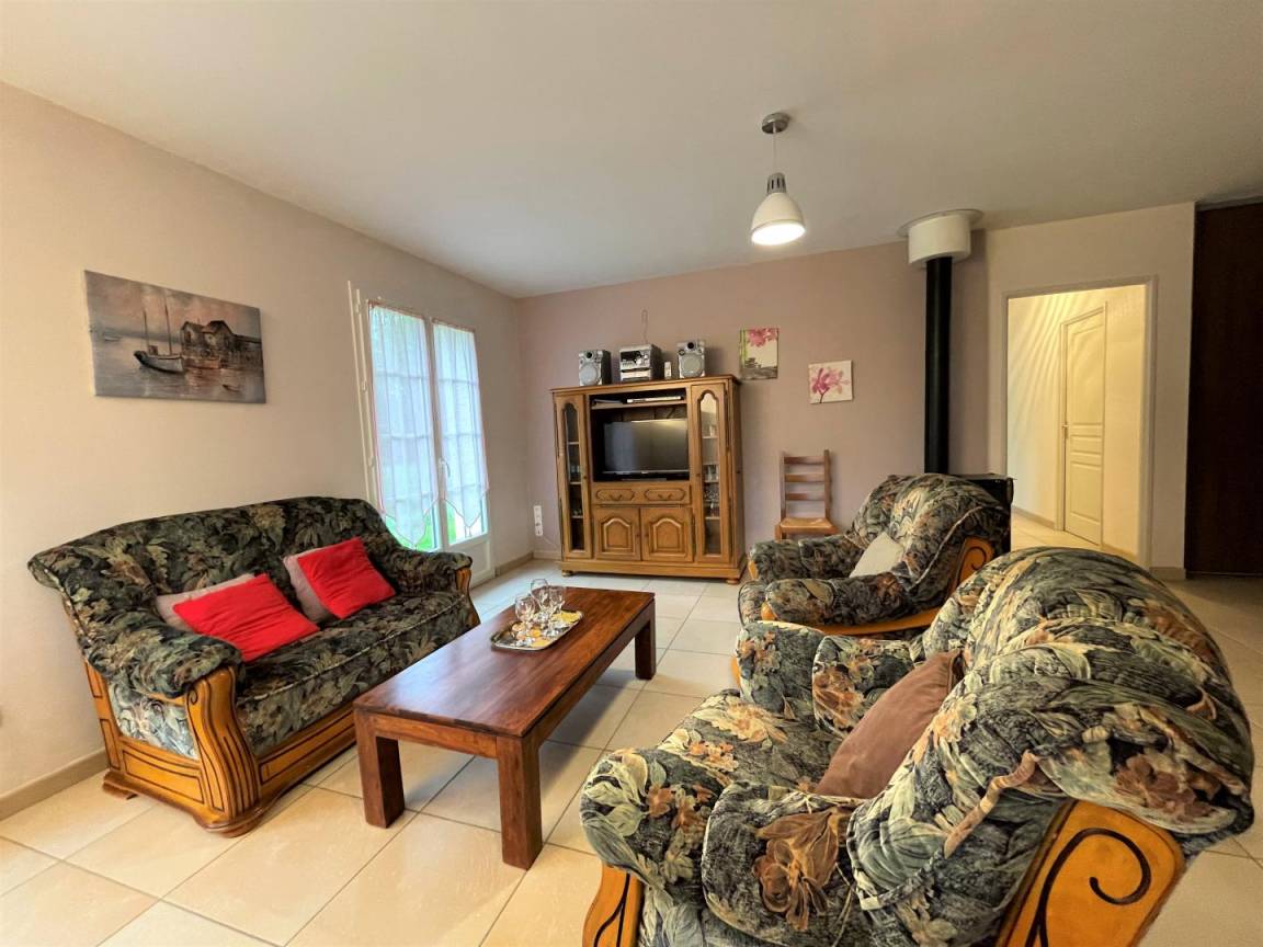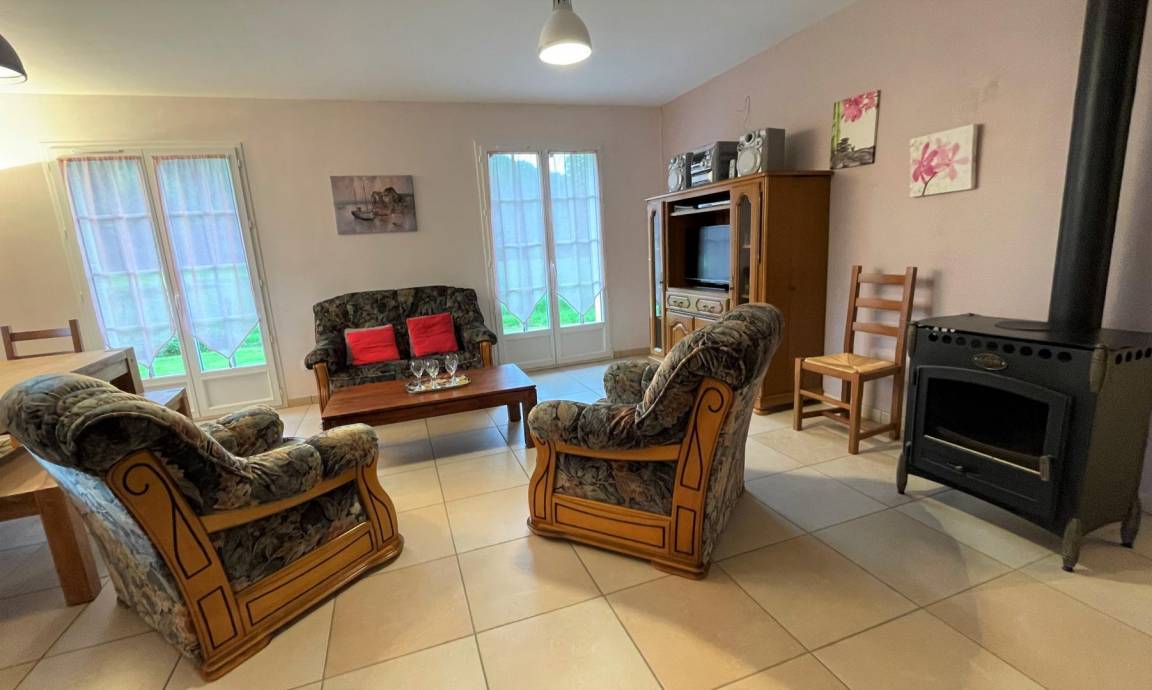 Wohnzimmer, Sitzecke (Holzofen, Hifi-Anlage-CD-Player, Fernseher und DVD-Player). Internetbox (Glasfaser).