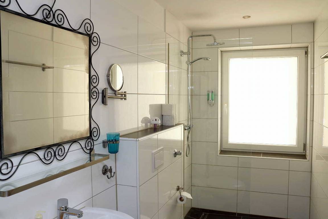 Das Badezimmer verfügt über einen Waschtisch, Spiegel, Kosmetikspiegel, WC und bodengleicher Dusche. Der Heizkörper ist als Handtuchheizung konzipiert, ein Föhn ist ebenfalls vorhanden.