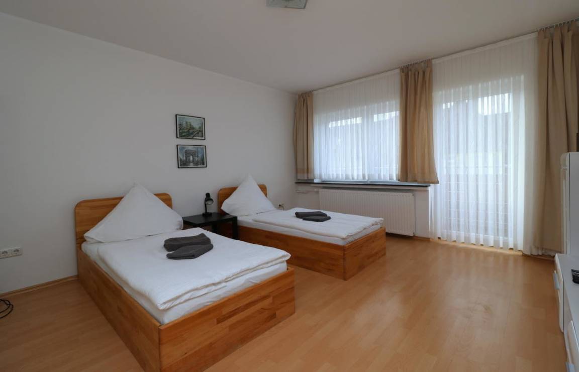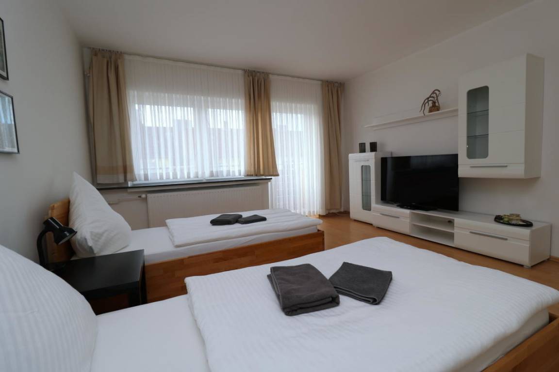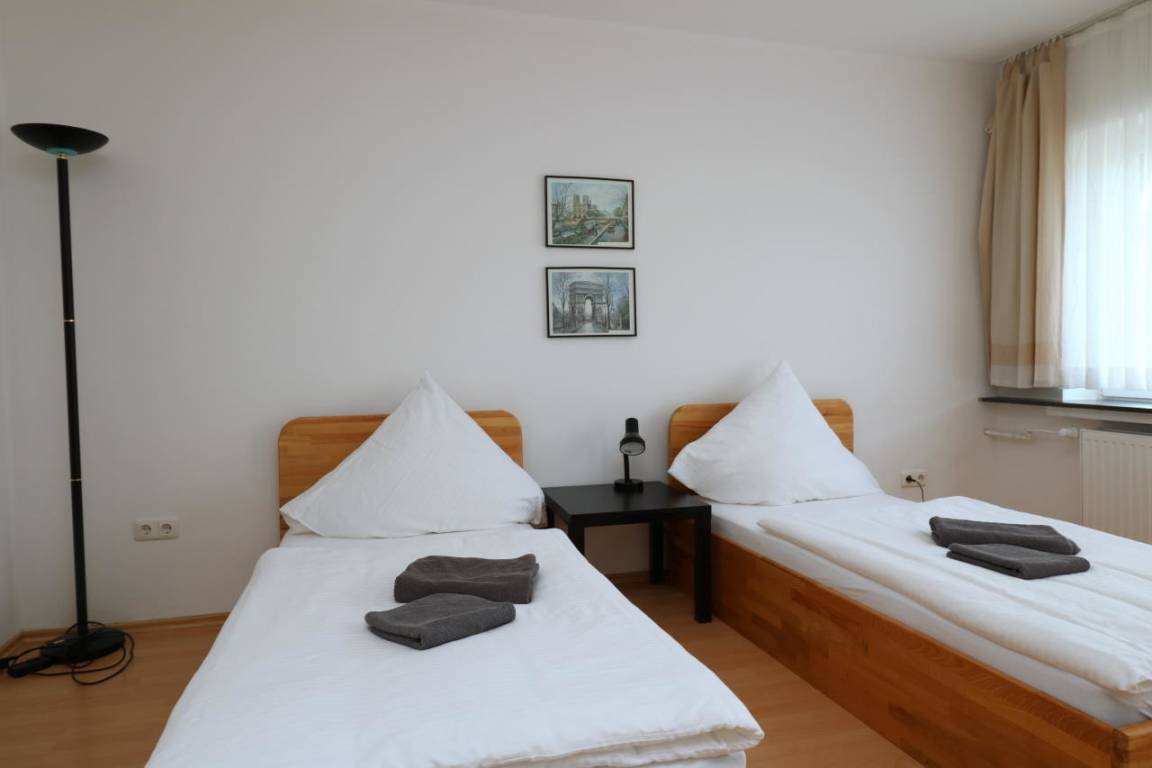 Apartment mit 4 Einzelbetten für 4 (max. 6) Personen. Preis gilt für 4 Personen, 2 Gästebetten hinzubuchbar, alle Preise enthalten die MwSt., Apartment geeignet für Monteure, Messebau-Mitarbeiter und Gruppen bis max. 6 Personen.