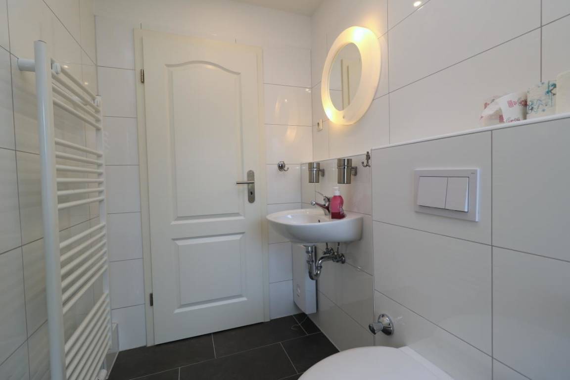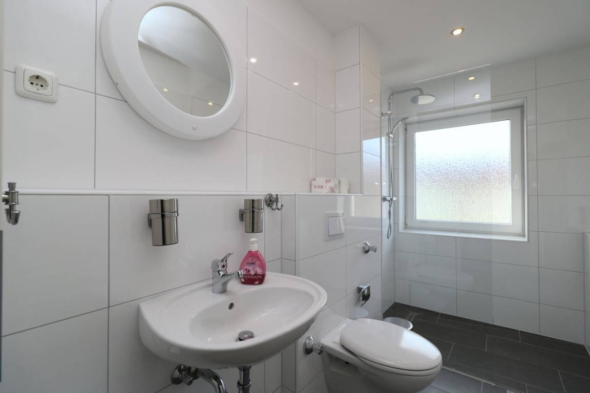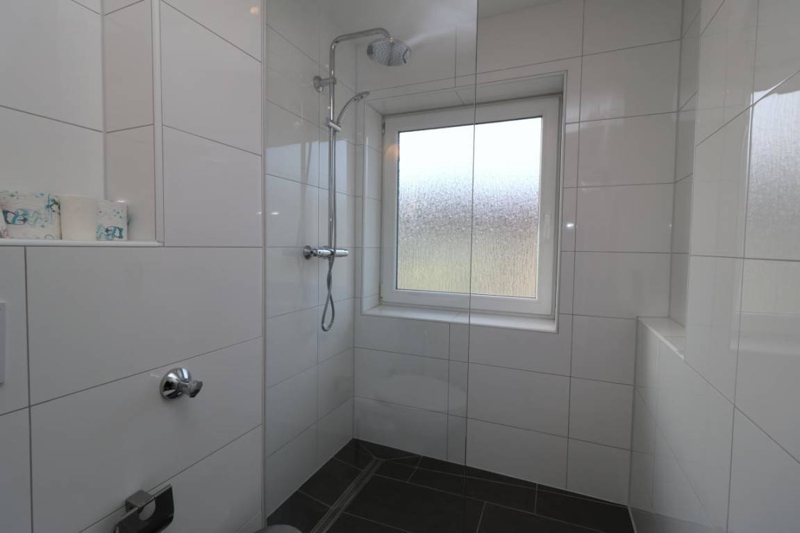 Das Duschbad besitzt eine ebenerdige Dusche, einen beleuchteten Spiegel, eine großzügige Ablage und WC. Ein Föhn ist ebenfalls vorhanden.