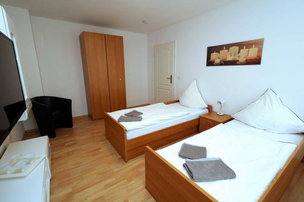 Schlafzimmer 1 (202) mit 2 Einzelbetten, einem Kleiderschrank, modernen Schrankelementen, Kabel-TV, kleinem Schreibtisch und Clubsessel. Schlafzimmer 2 (203) mit 2 Einzelbetten, einem Kleiderschrank, modernen Schrankelementen, Kabel-TV, kleinem Schreibtisch und Clubsessel, Zugang zum Balkon.