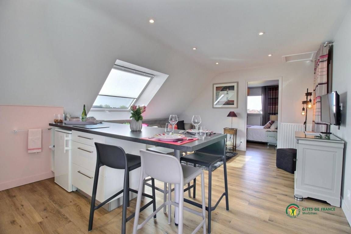 Diese Wohnung im ersten Stock des Hauses der Eigentümer besteht aus einer Einbauküche mit Zugang zum Wohnzimmer, einem Schlafzimmer mit einem 140x190-Bett und einem Duschraum mit WC.
