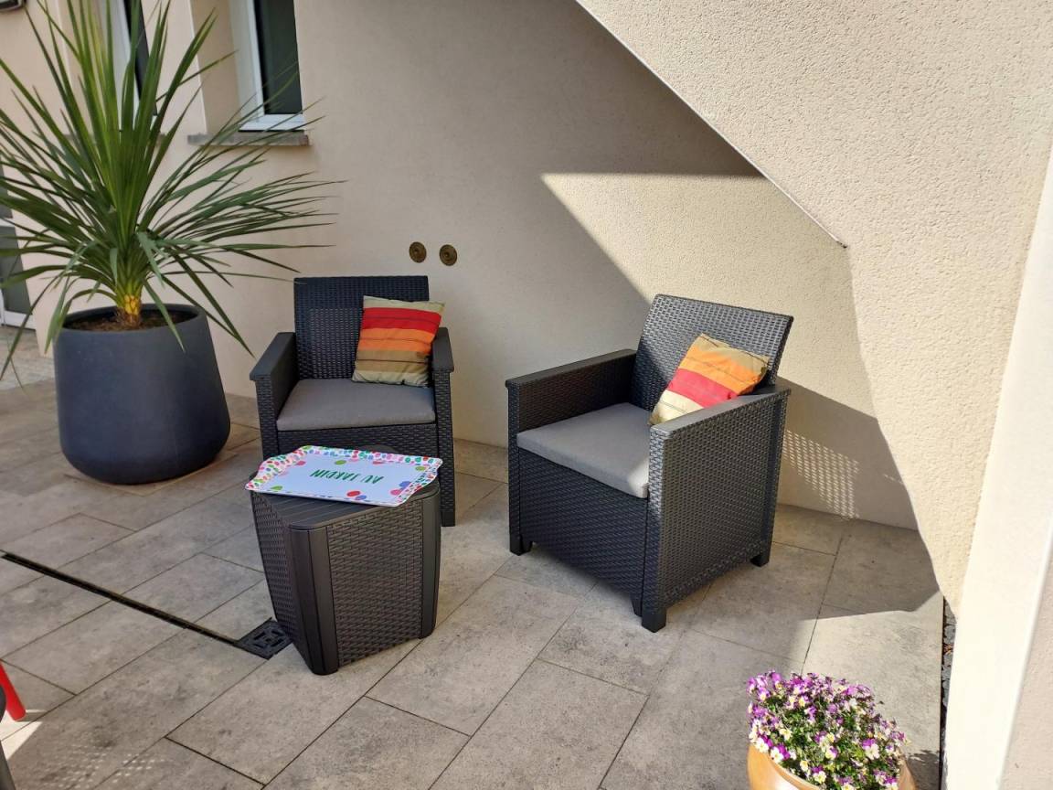 Draußen, über eine Treppe erreichbar, stehen Ihnen eine Terrasse mit Gartenmöbeln sowie ein Parkplatz zur Verfügung.