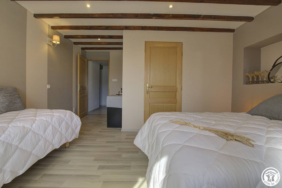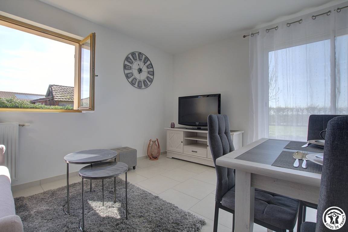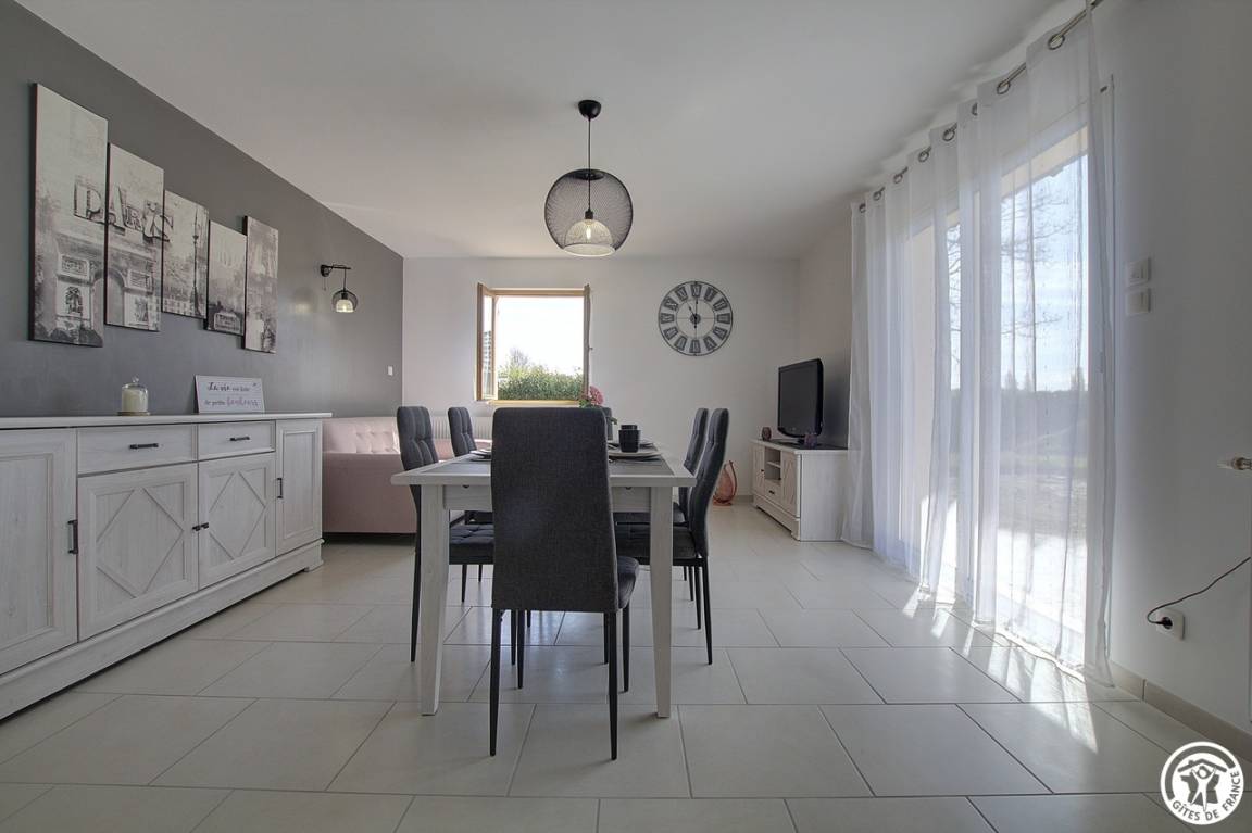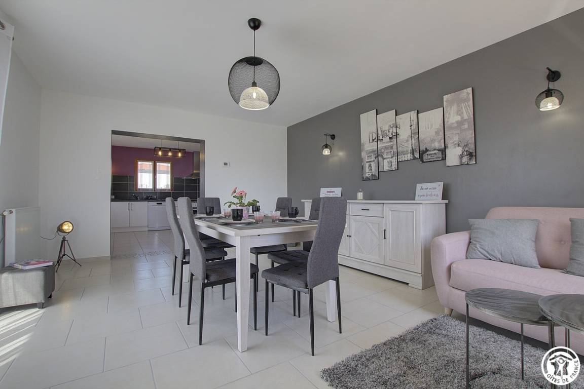 Im Herzen des Dorfes Etrez, 4,5 km von Montrevel en Bresse und 20 km von Bourg en Bresse entfernt, bietet dieses einstöckige Ferienhaus (83 m²) mit seinen zwei Schlafzimmern Platz für bis zu 6 Personen. Durch einen eigenen Eingang zur Gîte und in der Verlängerung des Hauses der Eigentümer öffnet sich der Haupteingang der Gîte in eine ausgestattete und funktionale Küche, die sich zu einem großen, sehr hellen Wohnzimmer mit Schlafgelegenheiten für eine Person öffnet. Von der Küche aus führt ein Flur zu einer separaten Toilette, einem Waschraum, einem begehbaren Duschbad und zwei Schlafzimmern. Das erste Schlafzimmer, in rosa und blauen Farben, besteht aus zwei 90 * 200 Betten, die nach Ihren Bedürfnissen oder Wünschen zusammengestellt werden können; Das zweite Schlafzimmer, das Elternschlafzimmer, in dem Taupe und Grau dominieren, ist für drei Personen ausgelegt: ein 140 * 200-Bett und ein 90 * 200-Bett. Dieses Schlafzimmer verfügt über ein eigenes Badezimmer im italienischen Stil mit in