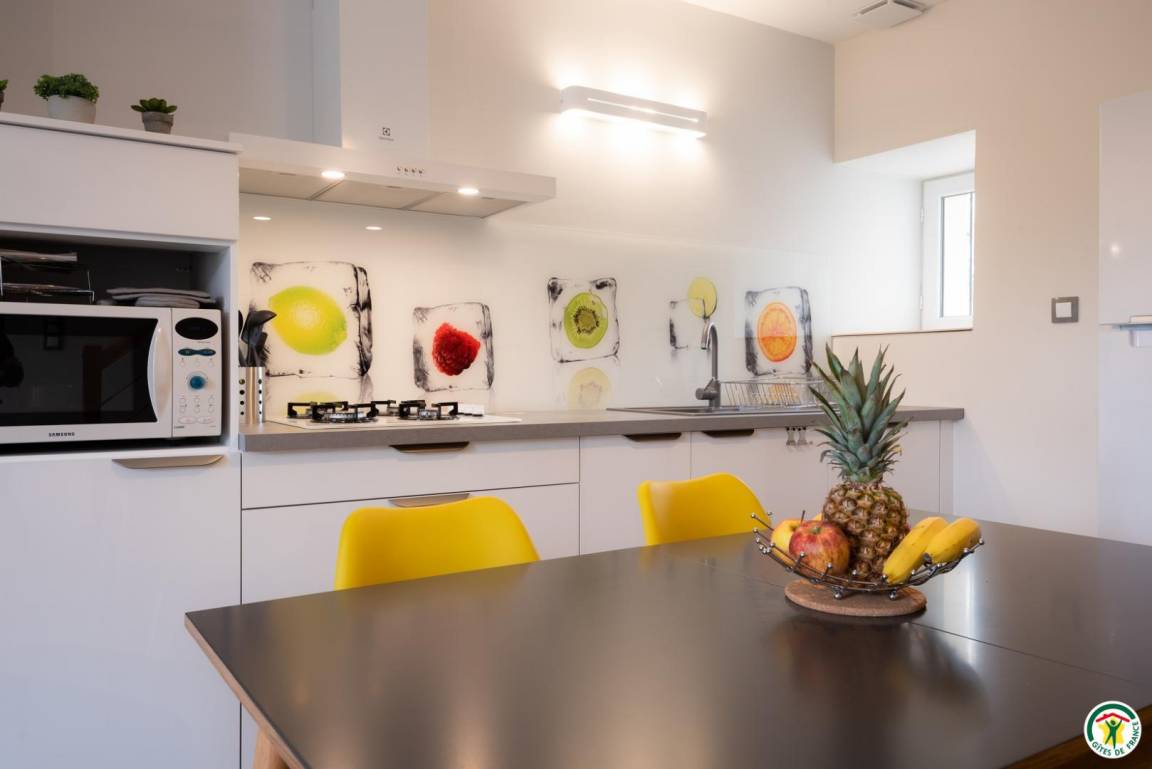 Maison Brette verrät von außen nichts von seinem modernen Komfort und seiner kompletten Ausstattung, bei der an alles gedacht wurde, damit es Ihnen an nichts mangelt und Sie sich wie zu Hause fühlen. Erdgeschoss: Die Glastür öffnet sich zum Wohnzimmer mit Küche und Sitzecke (Gesellschaftsspiele, TV, Radio), WC. Etage: 2 Schlafzimmer (2x80x200 oder 160x200) (2x70x190 oder 140x190), Badezimmer, Bürobereich. Zur Mitbenutzung: geschlossener Fahrradunterstand. Nur für Sie: schattiger Parkplatz (3 Plätze), Garten mit Obstbäumen. Auf der anderen Seite der kleinen Straße gelegen, ermöglicht Ihnen dieser nach Westen ausgerichtete Außenwohnbereich Momente der Entspannung (bretonisches Shuffleboard) und bietet ein wunderschönes Panorama. Um den Kleinen den Einstieg zu erleichtern: Hochstuhl, Reisebett, Stuhladapter, Badewanne, Wickelauflage, Töpfchen. Das Vorhandensein eines Bürobereichs und Glasfaser ist komfortabel, aber die Internetverbindung ist für Telearbeit nicht optimal.