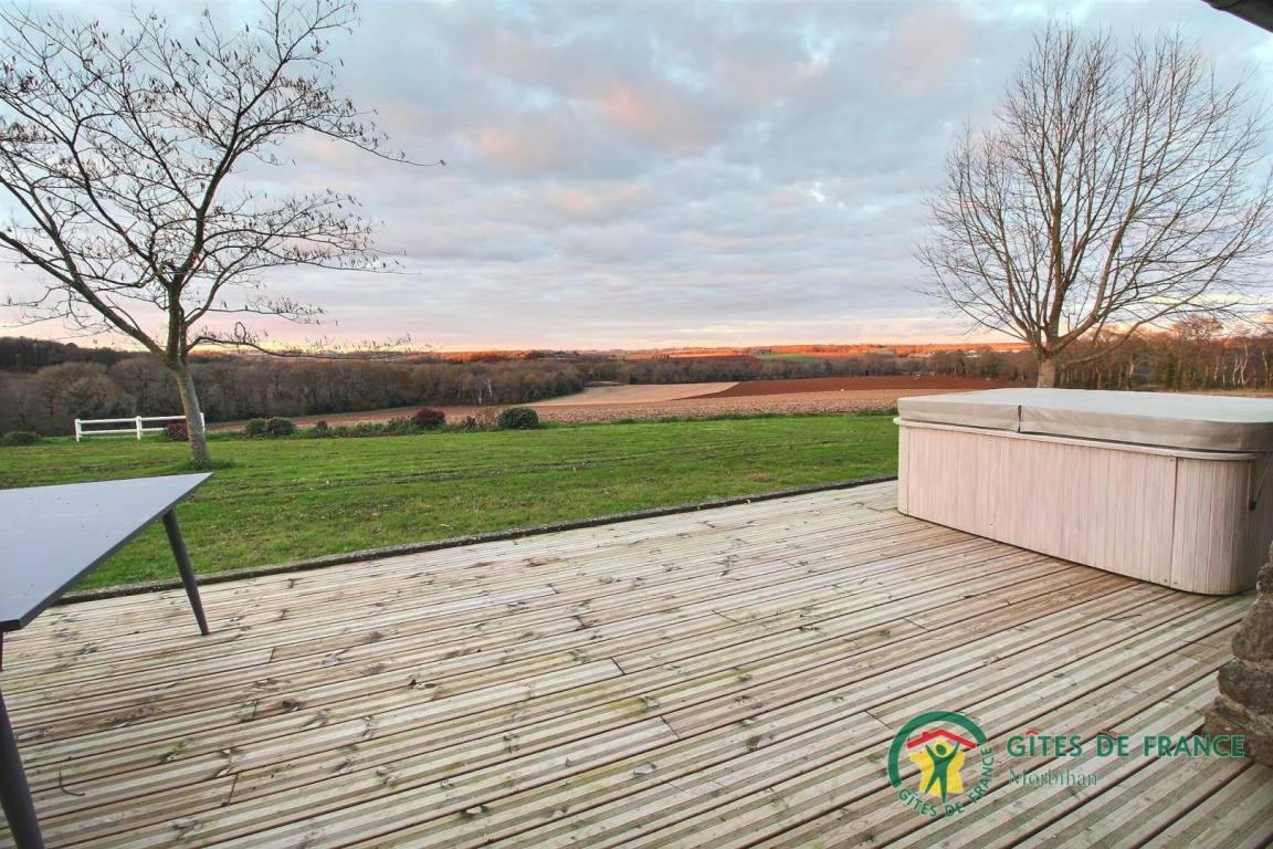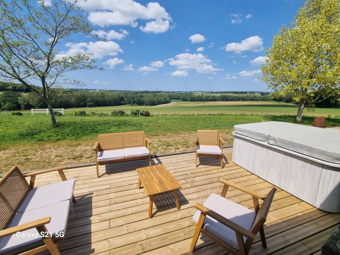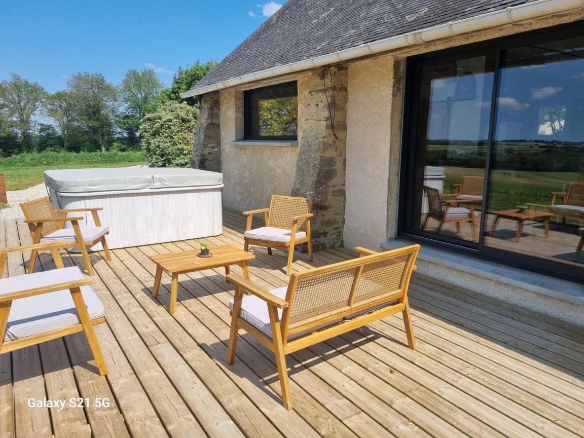 Garten mit Terrasse, ganzjährig geöffneter privater 3-Sitzer-Spa, Esstisch, Gartenmöbel, Grill und Liegestühle.
